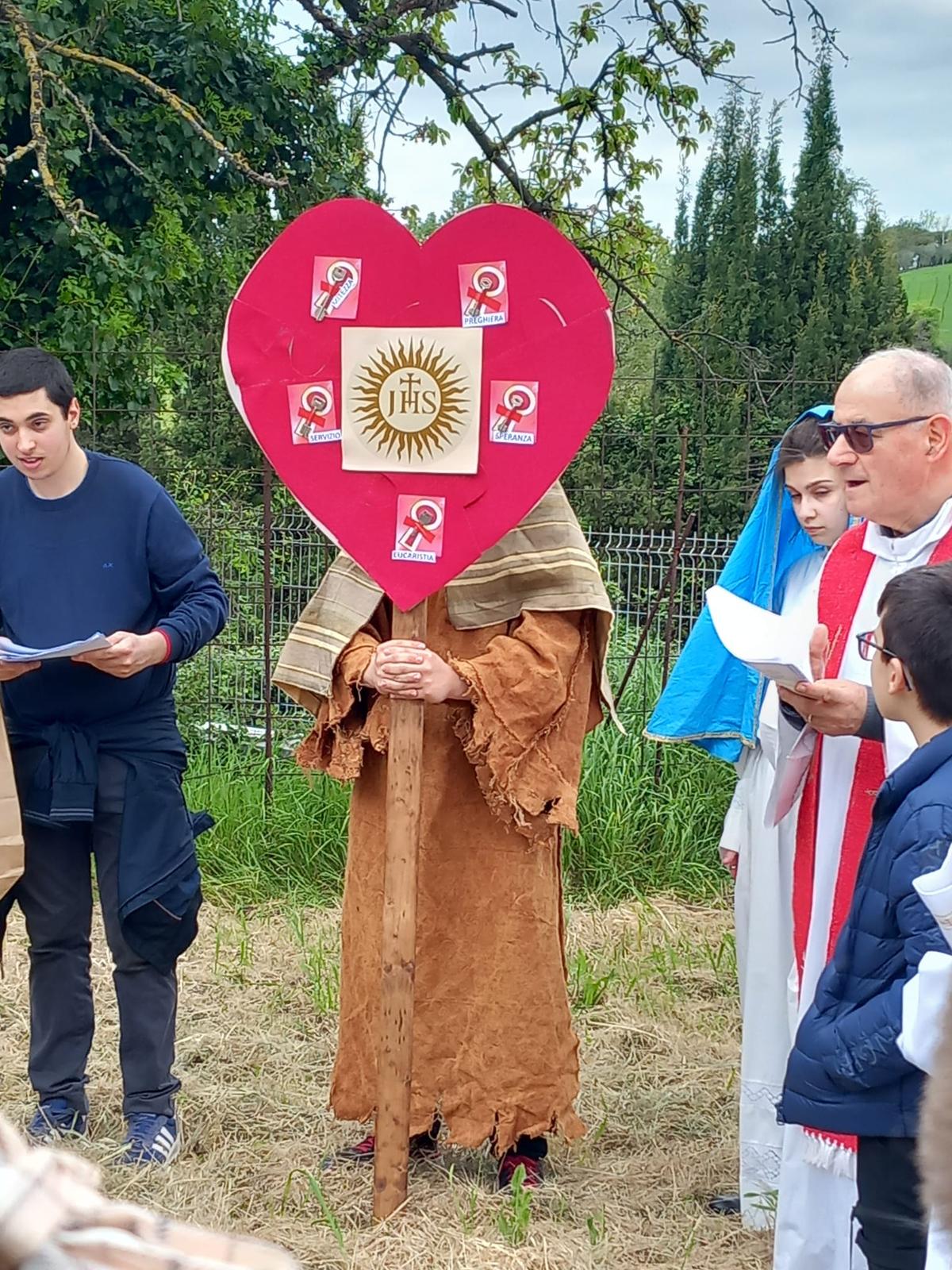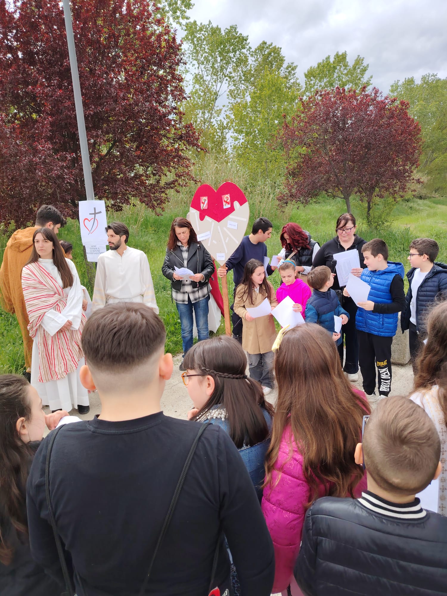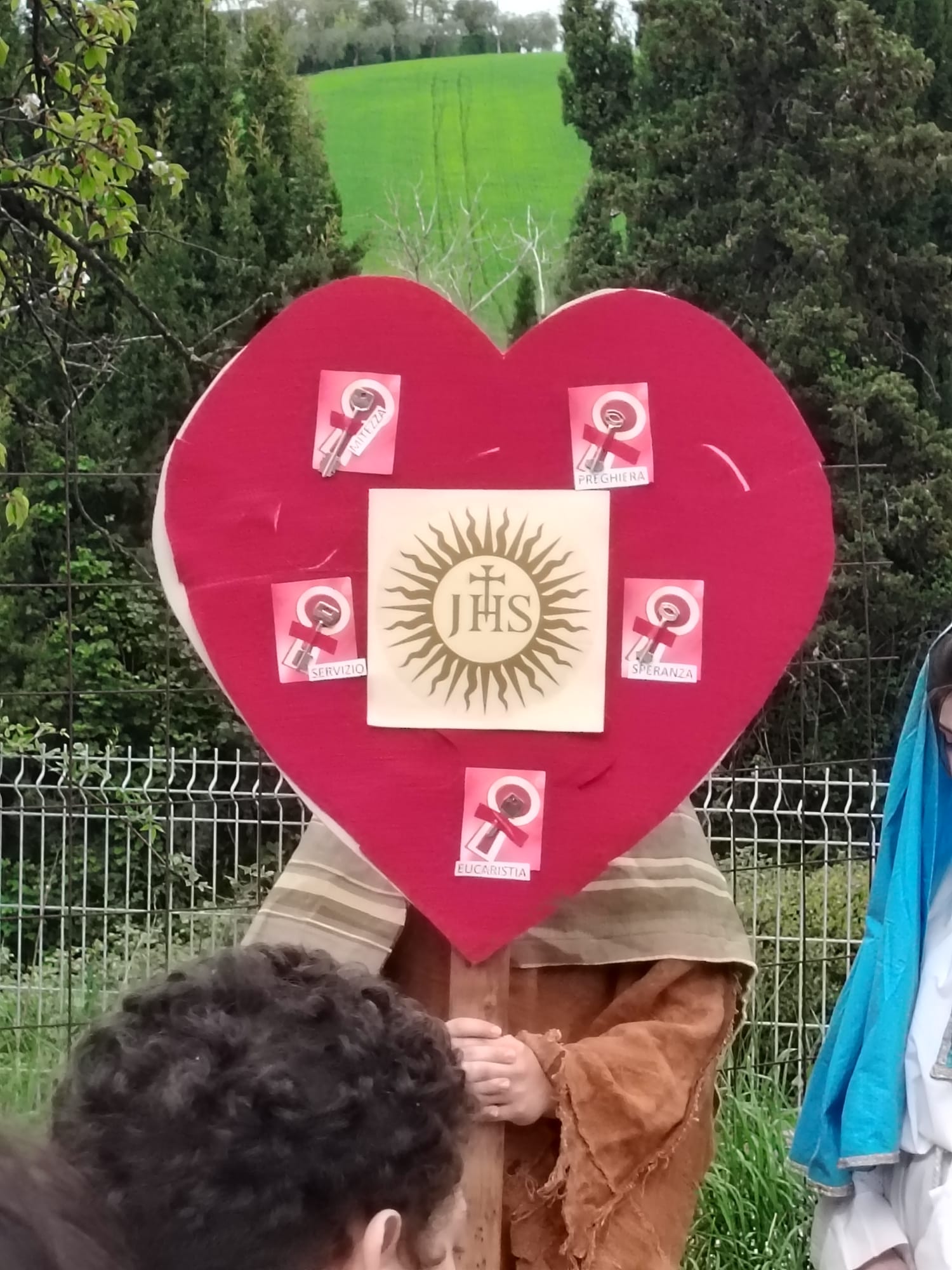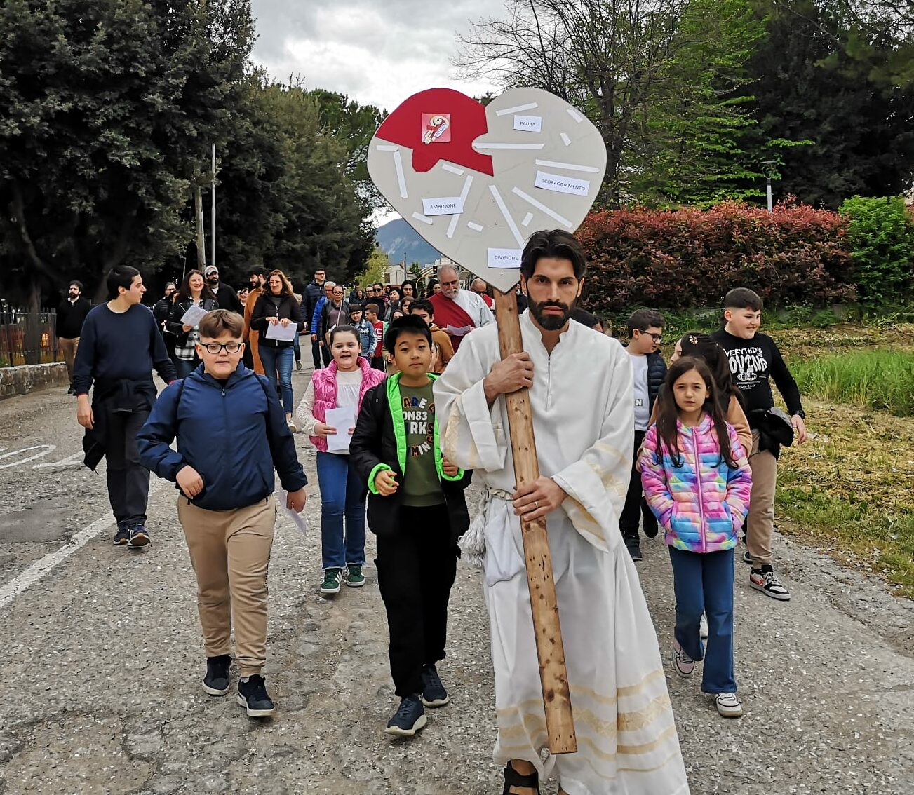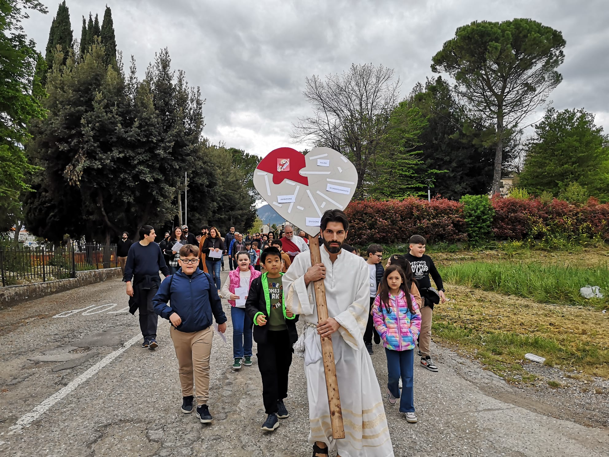 “Ogni anno cerchiamo di porre l’attenzione su un tema diverso – prosegue la prof.ssa Faenza –. Quest’anno, ad esempio, il titolo della Via Crucis è stato ‘Apri il tuo cuore’. Per tale ragione abbiamo realizzato un grande cuore di compensato che abbiamo posto sulla croce. Ci siamo ispirati al racconto evangelico dei discepoli di Emmaus, che all’inizio sono delusi e tristi e discutono tra loro, ma, dopo aver ascoltato la spiegazione di Gesù riguardante le Sacre Scritture e dopo averLo riconosciuto nel gesto dello spezzare il pane, sentono il loro cuore scaldarsi e finalmente tornare ad essere nella gioia. In ogni scena abbiamo inserito un personaggio che simboleggia un’emozione del cuore: Barabba per la rabbia che poi sarà trasformata in mitezza, Pietro per la paura che poi diventerà preghiera, Maria Salomé per l’ambizione che poi tramuterà in servizio, Maria (la madre di Gesù) per la speranza di fronte allo scoraggiamento ed infine il beato Carlo Acutis che indica l’Eucarestia come l’antidoto per eccellenza alle divisioni familiari e comunitarie. All”inizio della Via Crucis il cuore era bianco, quindi freddo come il ghiaccio. Man mano che abbiamo meditato le varie Stazioni, lo abbiamo trasformato, pezzo per pezzo, in un cuore rosso fuoco, segno del fatto che si fosse infiammato proprio come è capitato ai discepoli di Emmaus”.