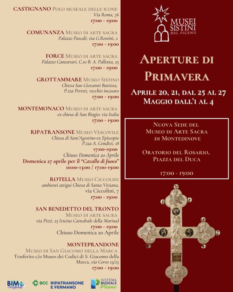 DIOCESI – Con l’arrivo della primavera, tornano le tanto attese Aperture di Primavera dei Musei Sistini del Piceno, un’occasione speciale per immergersi nella ricchezza del patrimonio artistico e religioso del territorio ascolano. Le aperture straordinarie si terranno nei giorni 20 e 21 aprile, dal 25 al 27 aprile e dall’1 al 4 maggio, dalle 17:00 alle 19:00, con alcune eccezioni legate a eventi locali.