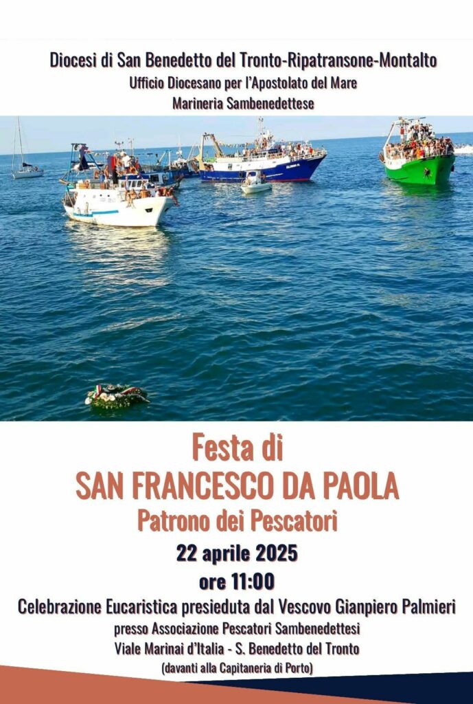 L’evento, organizzato dalla Diocesi di San Benedetto del Tronto-Ripatransone-Montalto attraverso l’Ufficio Diocesano per l’Apostolato del Mare, si terrà martedì 22 aprile alle ore 11:00 presso l’Associazione Pescatori Sambenedettesi, in Viale Marinai d’Italia, davanti alla Capitaneria di Porto.