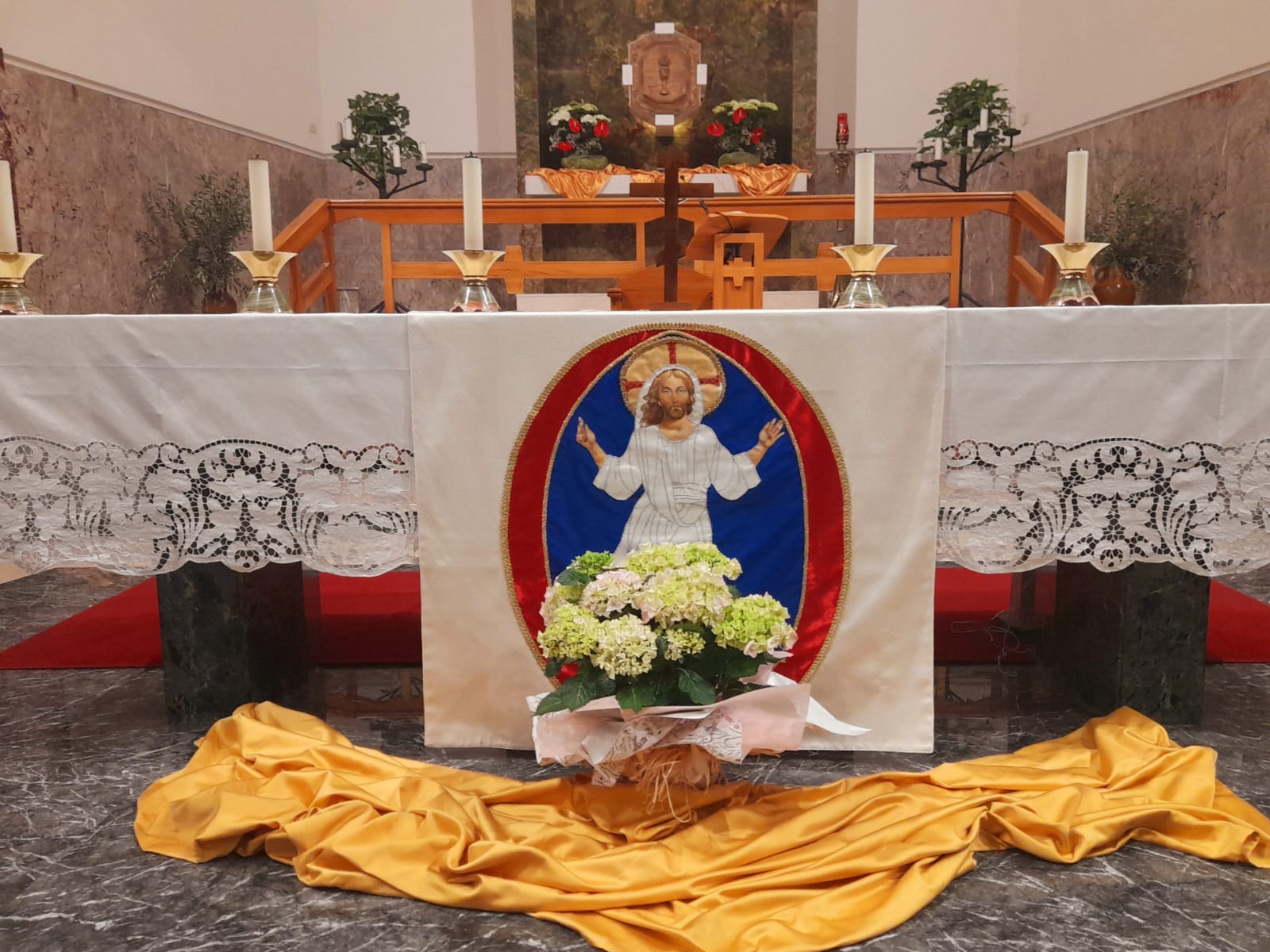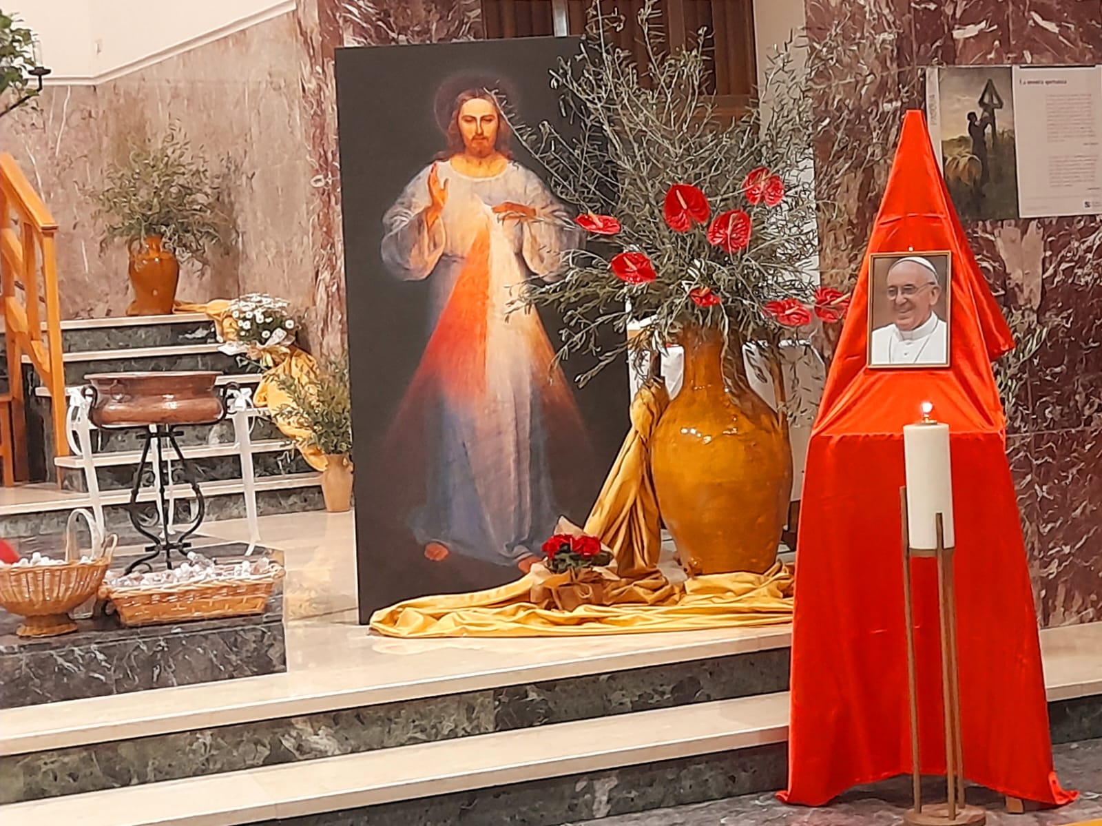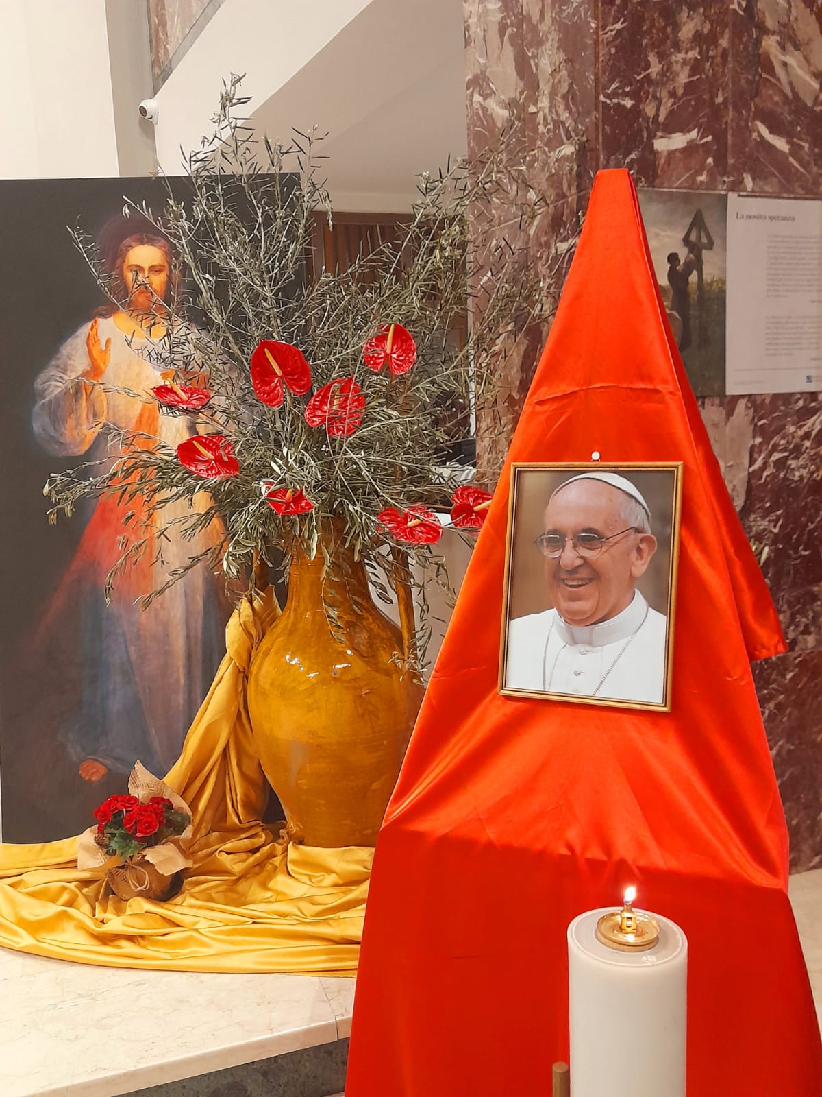 ASCOLI PICENO – Una foto del volto sorridente di Papa Francesco, a ricordare la tenerezza, la gioia e, a tratti, l’umorismo che ha donato a chiunque lo abbia incontrato. Una fiamma tenue ma viva, quella del cero acceso davanti alla sua immagine, a rappresentare la fede che lo ha sempre sostenuto e la luce che ha portato nel mondo. Un’anfora ricolma di rami di ulivo, a rievocare il suo grido di pace per l’umanità intera, un desiderio che ha manifestato fino all’ultimo anelito. Alle sue spalle una tela liberamente ispirata al quadro di Gesù misericordioso, a ricordare non solo la visita che Papa Francesco fece nel 2016 al santuario della Divina Misericordia, ma anche l’essenza del suo Pontificato, basato proprio sull’immensa misericordia di Dio e sull’affidarsi totalmente a Lui, come recita l’iscrizione presente nell’opera originale: “Gesù, io confido in Te!”. Una misericordia che tocca ciascuno di noi e che è così grande da dover essere riversata, a sua volta, ad ogni fratello e ad ogni sorella che incontriamo lungo il nostro cammino.