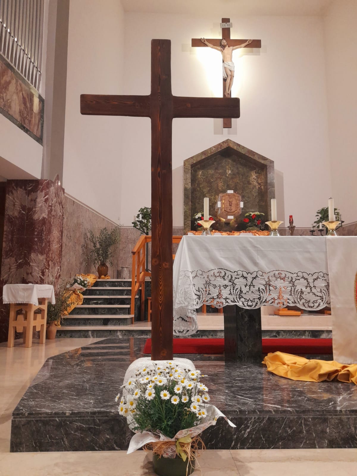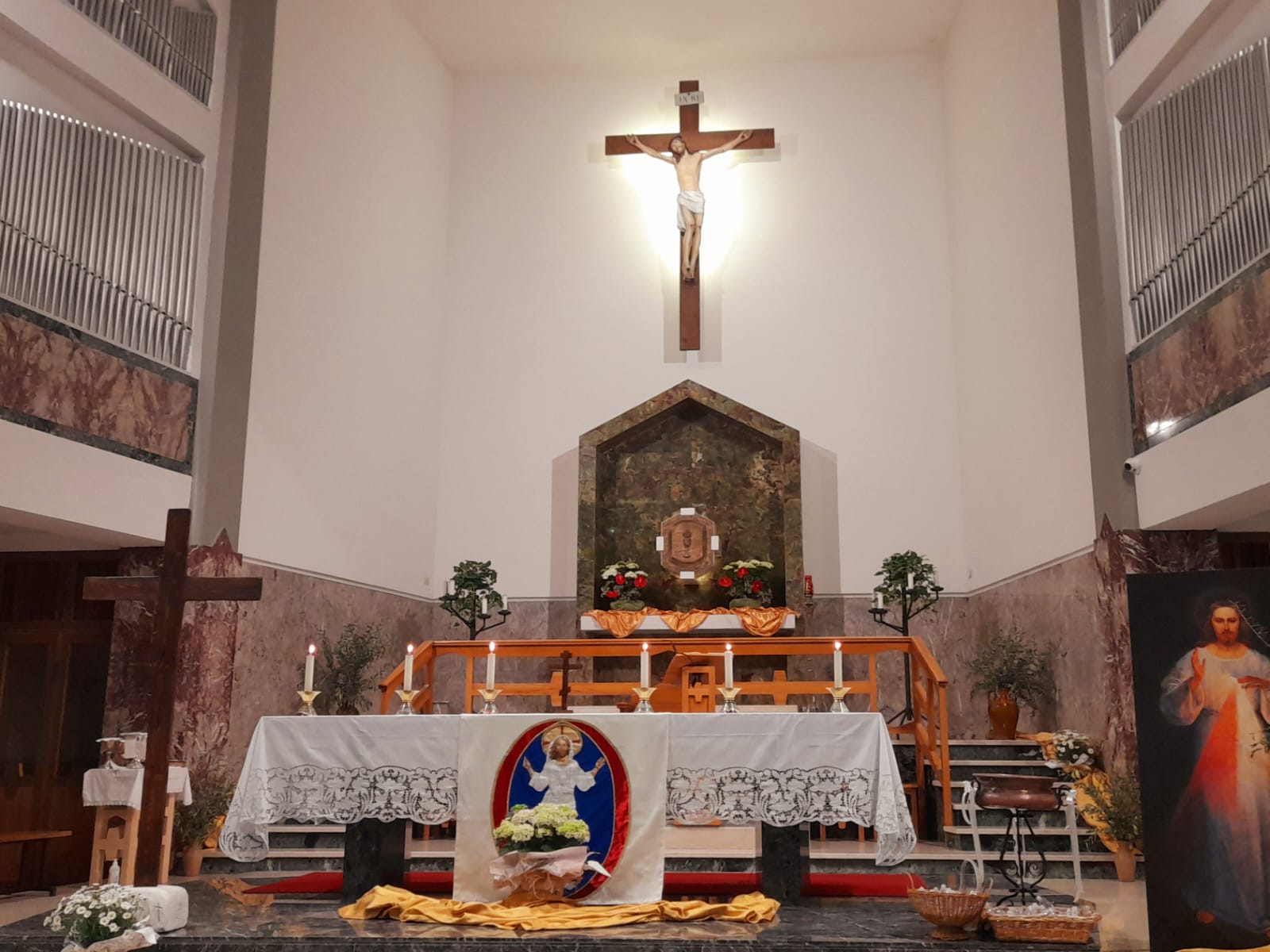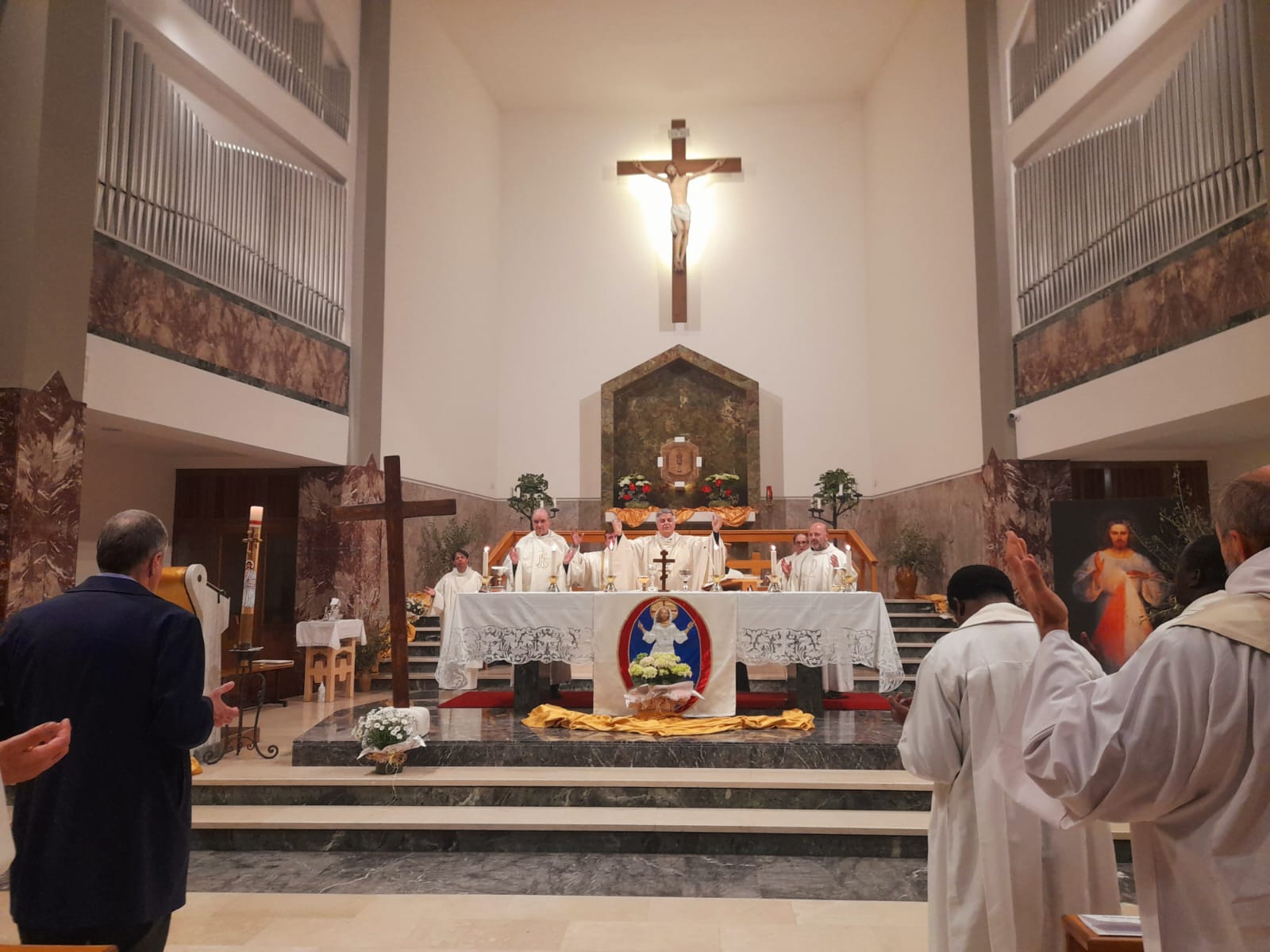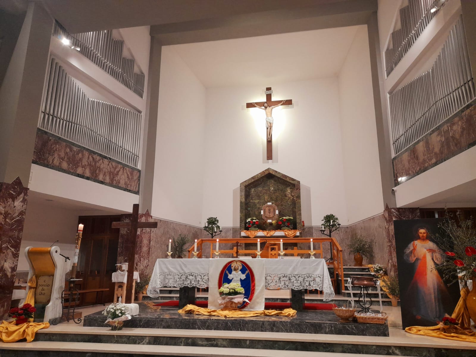 ASCOLI PICENO – Una foto del volto sorridente di Papa Francesco, a ricordare la tenerezza, la gioia e, a tratti, l’umorismo che ha donato a chiunque lo abbia incontrato. Una fiamma tenue ma viva, quella del cero acceso davanti alla sua immagine, a rappresentare la fede che lo ha sempre sostenuto e la luce che ha portato nel mondo. Un’anfora ricolma di rami di ulivo, a rievocare il suo grido di pace per l’umanità intera, un desiderio che ha manifestato fino all’ultimo anelito. Alle sue spalle una tela liberamente ispirata al quadro di Gesù misericordioso, a ricordare non solo la visita che Papa Francesco fece nel 2016 al santuario della Divina Misericordia, ma anche l’essenza del suo Pontificato, basato proprio sull’immensa misericordia di Dio e sull’affidarsi totalmente a Lui, come recita l’iscrizione presente nell’opera originale: “Gesù, io confido in Te!”. Una misericordia che tocca ciascuno di noi e che è così grande da dover essere riversata, a sua volta, ad ogni fratello e ad ogni sorella che incontriamo lungo il nostro cammino.