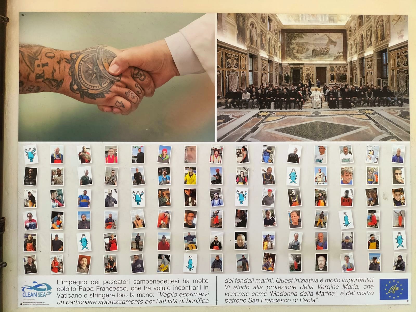 “Sono un privilegiato, poiché ho partecipato a due incontri con Papa Francesco. La prima volta si è trattato di un incontro fugace per via dei numerosi impegni del Pontefice. La seconda volta, invece, in Sala Paolo VI, lo scorso Novembre, mi sono veramente emozionato. Papa Francesco, infatti, mi ha stretto la mano e l’ha trattenuta per un po’; poi mi ha chiesto come stesse procedendo la raccolta dei rifiuti in mare e io gli ho risposto che stiamo proseguendo la nostra attività e che la quantità di plastica raccolta, rispetto ai primi anni, è diminuita, segno che si sta maturando una certa sensibilità e che il mare è sempre più pulito, anche grazie al nostro contributo. Il Santo Padre, dopo aver ricevuto l’invito a venire a San Benedetto, mentre si congedava, mi ha detto: ‘Io mi ricordo sempre di voi!’. Parole non scontate o di circostanze, ma profondamente vere, dal momento che più volte Papa Francesco ha citato la nostra Marineria come esempio di cura del Creato da seguire e da imitare. Anche noi ci ricorderemo sempre di lui“.