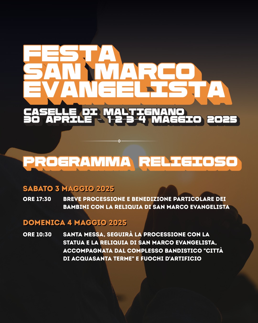 MALTIGNANO – Torna la festa di San Marco Evangelista a Caselle di Maltignano, quest’anno evento rimandato al prossimo 30 aprile, 1-2-3-4 maggio in segno di rispetto per il lutto nazionale proclamato in onore della scomparsa di Papa Francesco e in piena sintonia con le autorità religiose locali. Una delle feste tra le più sentite nell’ascolano e nel vicino Abruzzo, organizzata dal Comitato Parrocchiale “San Marco Evangelista” con il Patrocinio del Comune di Maltignano.