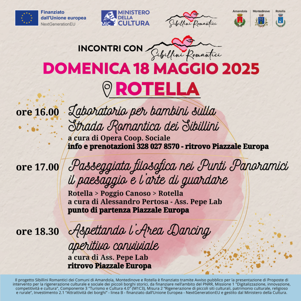 “Sibillini Romantici” è un progetto dei Comuni di Amandola, Montedinove e Rotella, finanziato dall’Unione Europea – Next Generation EU, nell’ambito del PNRR M1C3I2.1 – Attrattività dei borghi – Linea B, e gestito dal Ministero della Cultura.
