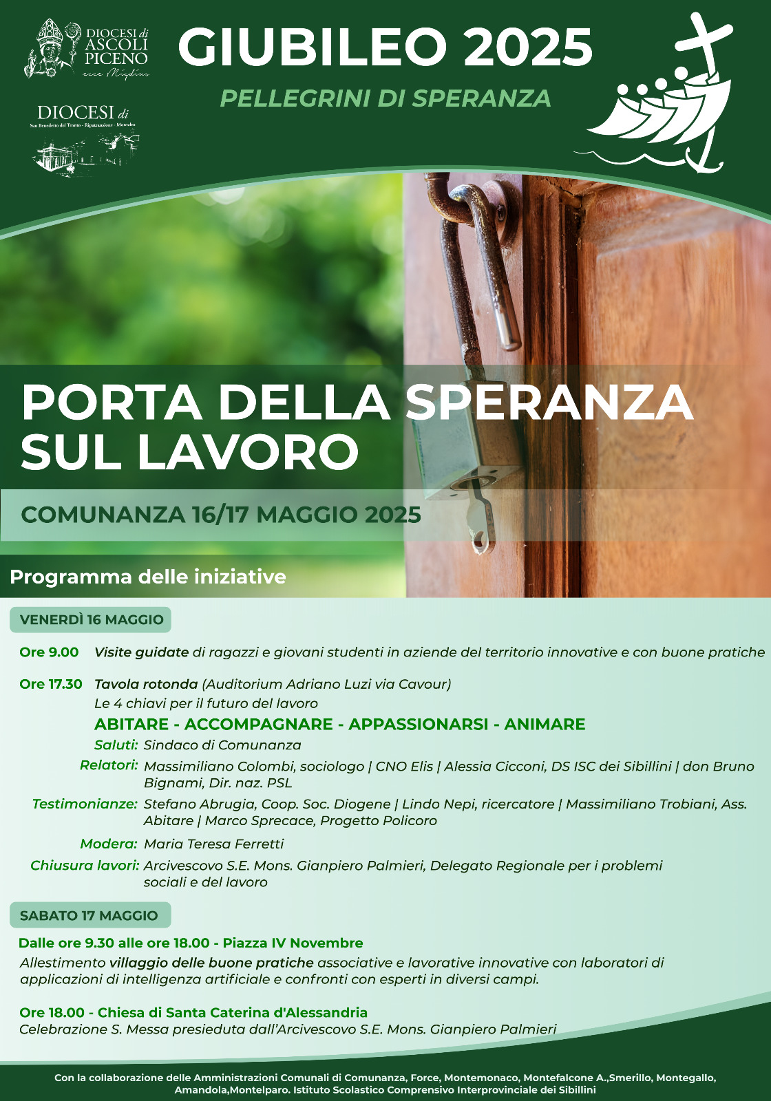 Nella giornata di sabato 17 maggio, invece, dalle ore 9,30 alle ore 18, nella piazza 4 Novembre di Comunanza verrà allestito un villaggio delle buone pratiche associative e lavorative in chiave innovativa, con laboratori di applicazione di intelligenza artificiale e confronti con esperti in diversi campi. A chiudere il cerchio sulla porta della speranza dedicata al lavoro sarà la Santa Messa, in programma alle ore 18, presieduta dal Vescovo Gianpiero Palmieri.