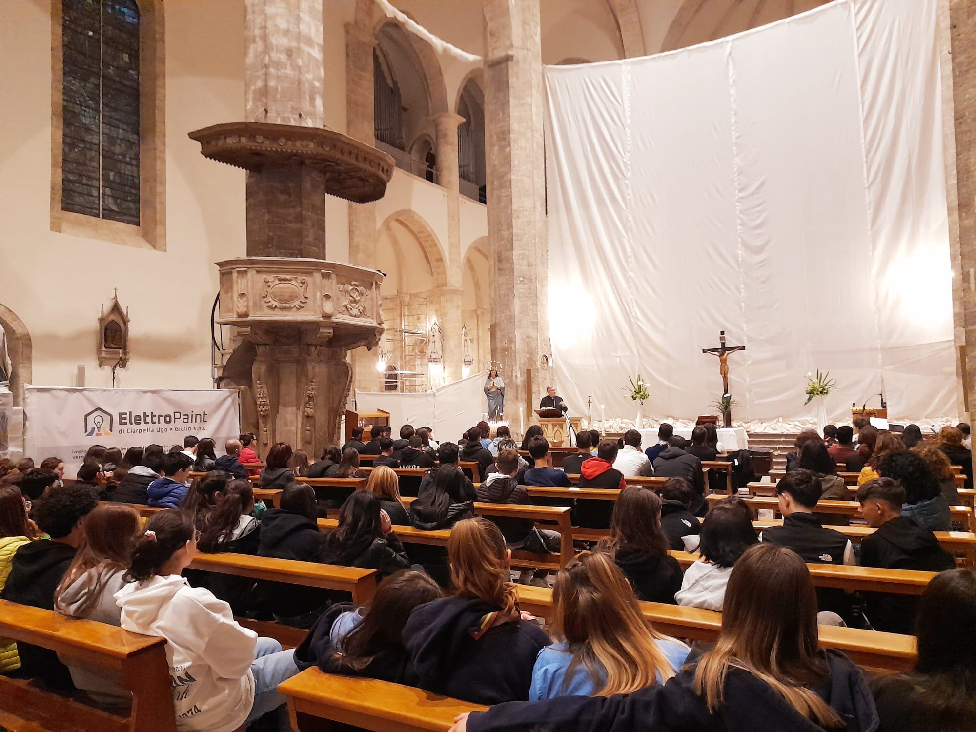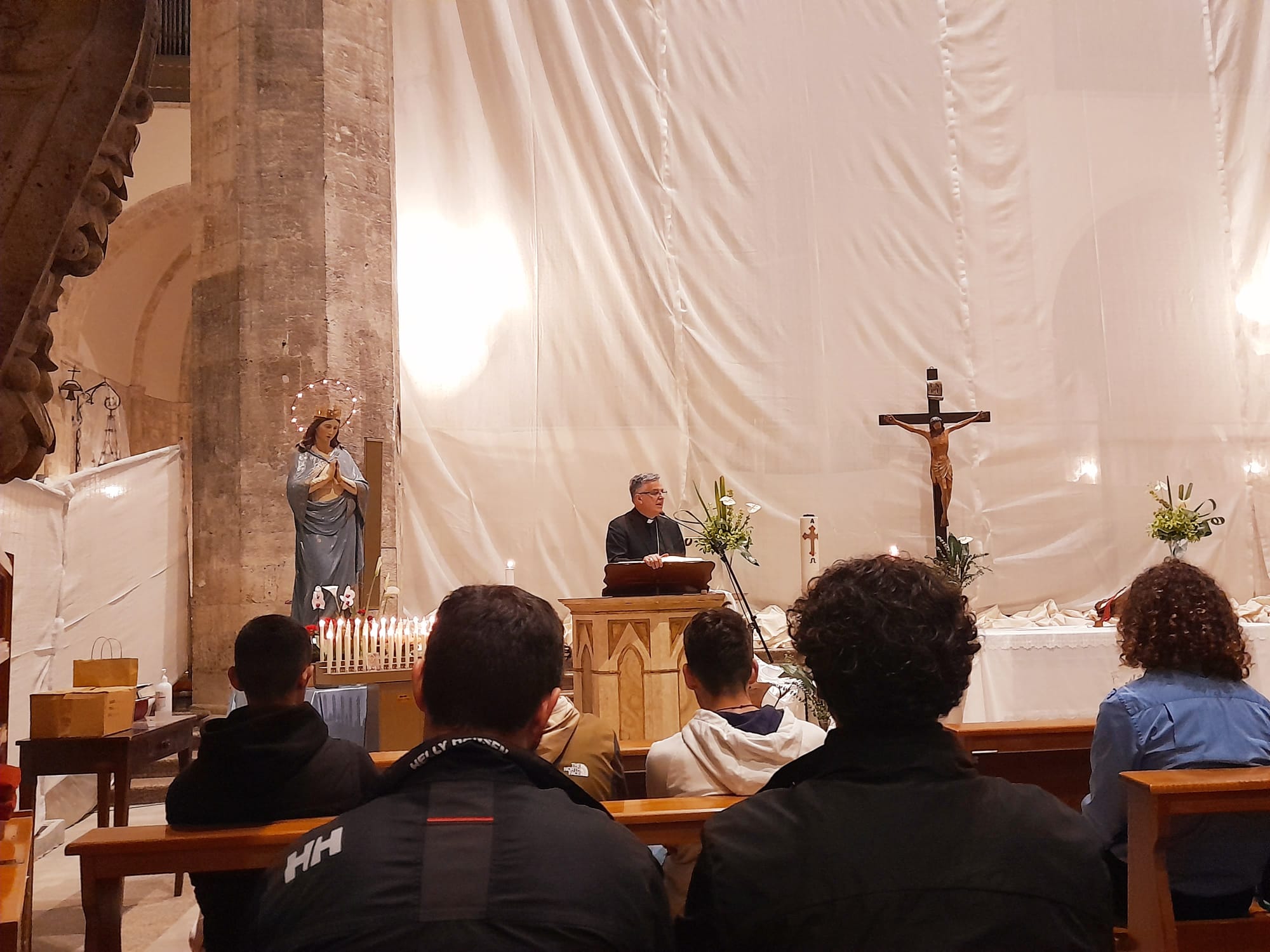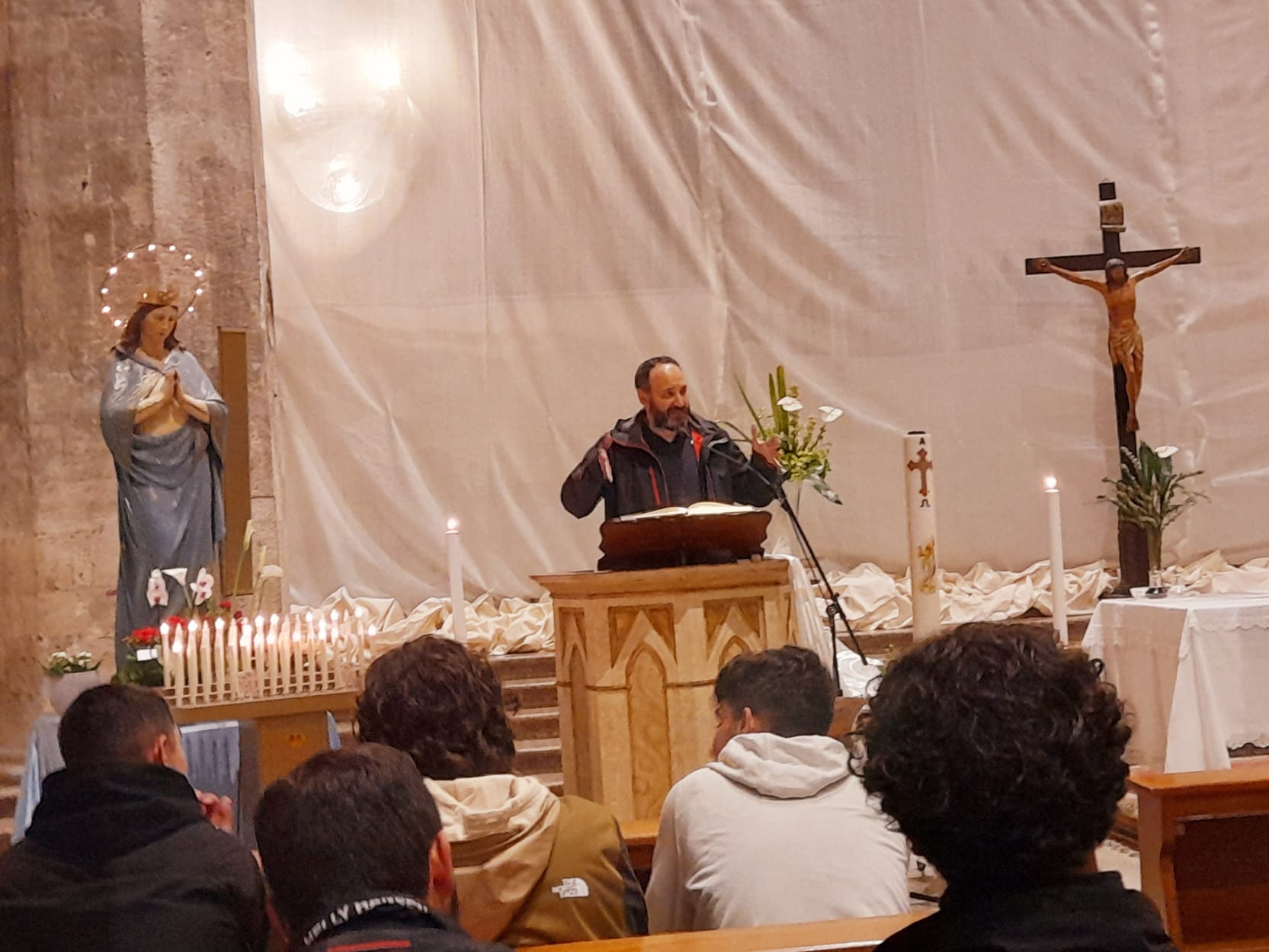 Queste le parole del vescovo Palmieri ai giovani presenti: “Nella tomba di Gesù succede qualcosa di nuovo, di straordinario. La Resurrezione di Gesù, infatti, non è la rianimazione del cadavere di Gesù, come era avvenuto per Lazzaro, che era morto, ma il suo cadavere è stato rianimato. No! La Resurrezione di Gesù è tutta un’altra cosa. Il corpo di Gesù scompare, sparisce. Cosa è successo? È come se Gesù avesse sfondato la porta della morte e fosse entrato per sempre nella vita di Dio. Gesù è il Dio che si è fatto uomo; dal mondo di Dio Gesù viene e ora, sfondando la porta della morte, entra nella vita di Dio. È la prima volta che un uomo sfonda la porta della morte. Nessun uomo ci è riuscito prima. Soltanto Dio fatto uomo, lo fa! La Resurrezione non è un cadavere che si rianima e non è nemmeno il fatto che Gesù ormai sia con me sempre. Cos’è allora la Resurrezione? Papa Benedetto ce lo ha spiegato bene: ci ha detto che, con la Resurrezione, la storia dell’uomo entra in una dimensione nuova, la dimensione di Dio, la dimensione dell’eternità. È come se ci fosse un cielo nuovo, una terra nuova, un uomo nuovo, una donna nuova, per l’eternità. Questo atto di risorgere con Dio e diventare con Lui una cosa sola, come fa Gesù – ci dice la Scrittura – può avvenire già adesso. Adesso! Con il Battesimo, tu sei già morto con Gesù e già vivo con Lui per sempre. Tu non sei fatto per la colpa, tu sei fatto per la vita. Per sempre. Hai già sfondato la porta della morte, sei già entrato nel Regno, sei già entrato nel giorno senza tramonto. Sei già diventato una persona luminosa. Ecco perché nella tomba ci sono due uomini vestiti di bianco. Questo è il nostro cammino: diventare uomini e donne vestiti di bianco, totalmente trasfigurati dalla Luce dello Spirito Santo, totalmente trasformati, fatti nuovi dalla luce di Gesù Risorto. Ed è così, perché, quando noi facciamo cambiare il cuore da Gesù, quando ci facciamo riempire di Spirito Santo e dalla Sua luce, quando indossiamo la veste bianca del Battesimo, quando diventiamo uomini nuovi, ecco che comincia già quaggiù la vita eterna. Quando parla della vita eterna, Gesù non si riferisce al Paradiso. Egli dice: ‘Chi crede in me avrà la vita eterna’. Significa che la vita eterna inizia qui e che è talmente bella che niente la può fermare. Noi allora siamo tutti chiamati a rinascere in Gesù, siamo tutti chiamati a mettere la veste bianca, a diventare uomini e donne nuovi, luminosissimi!“.