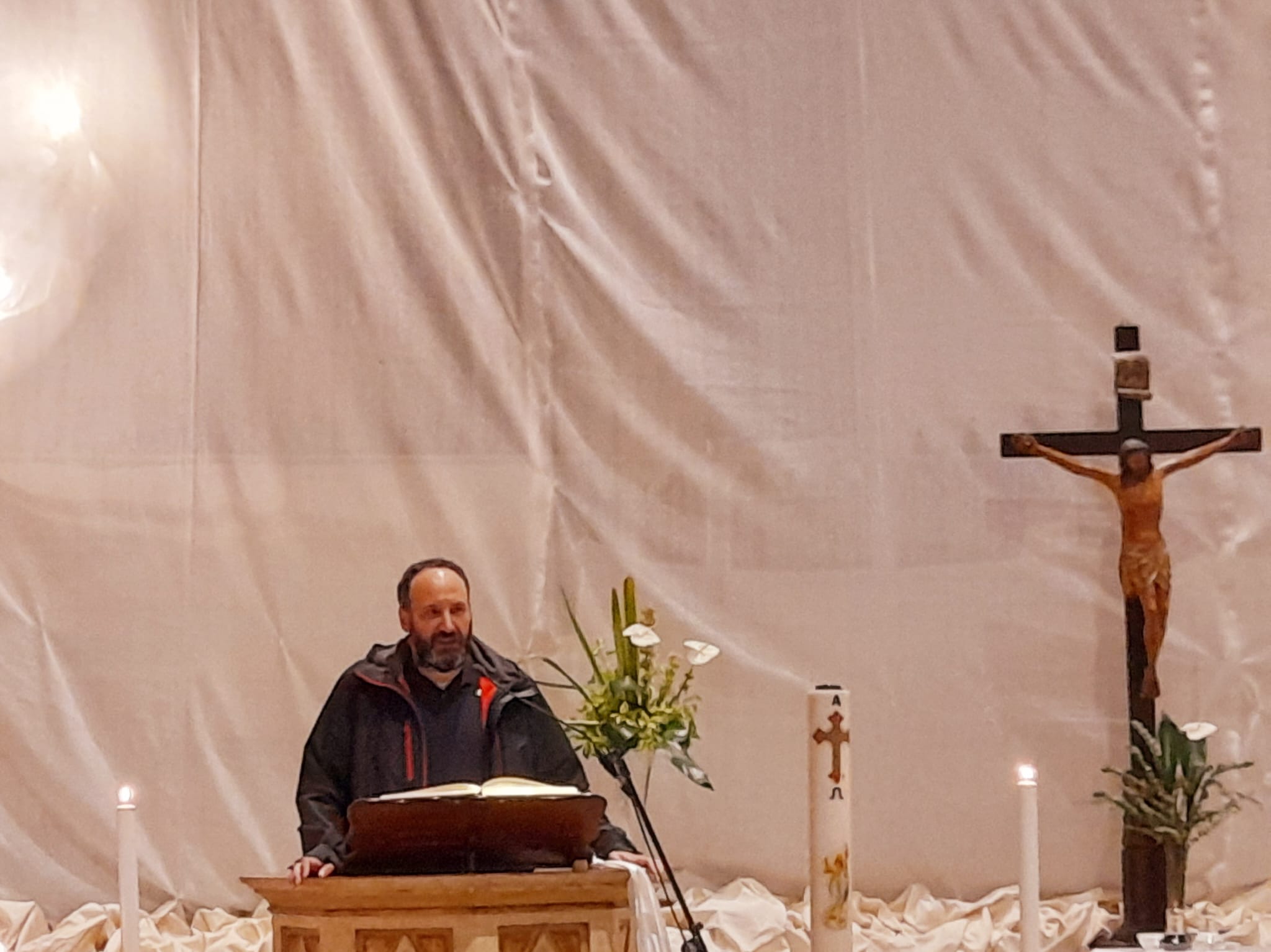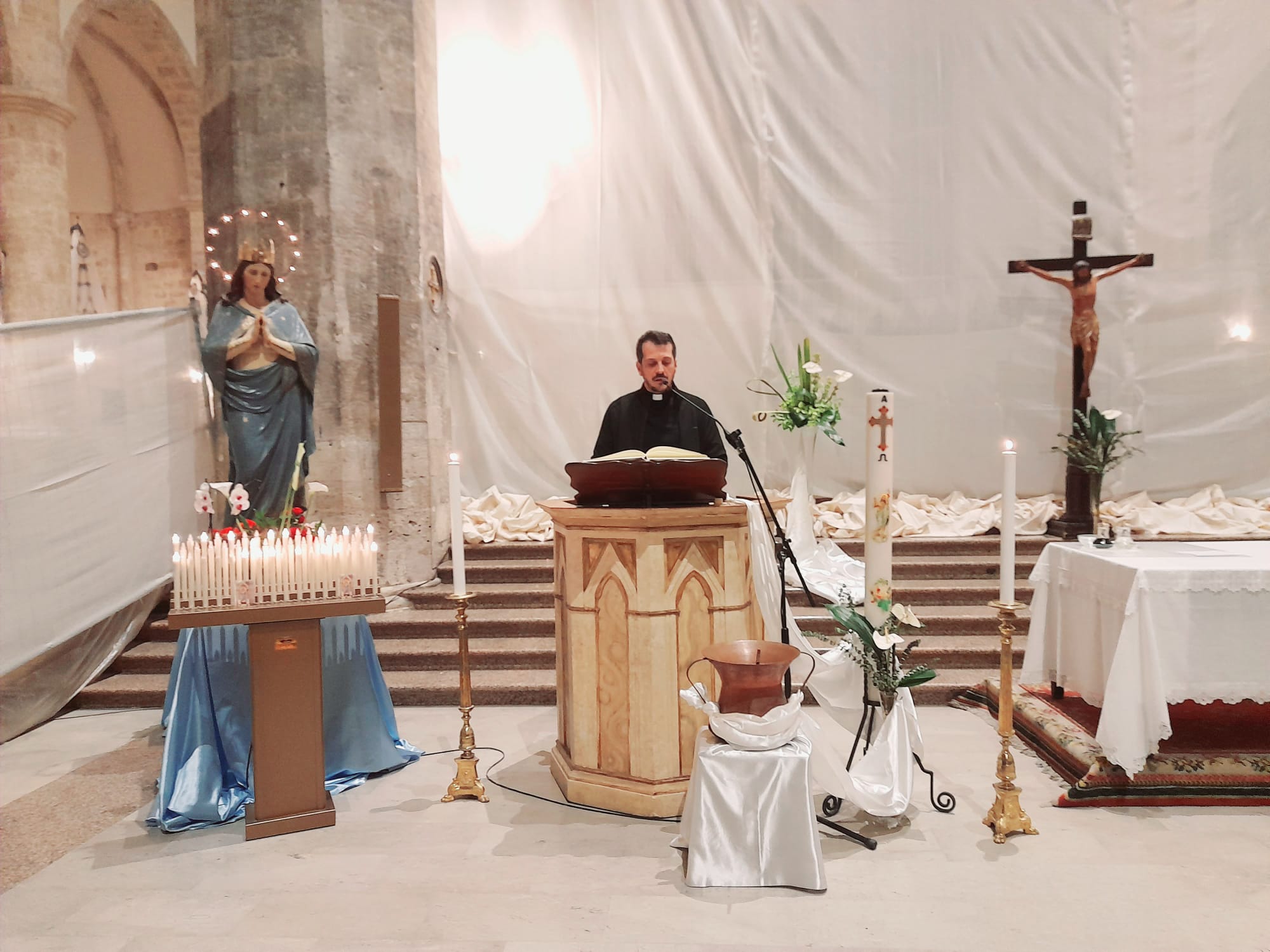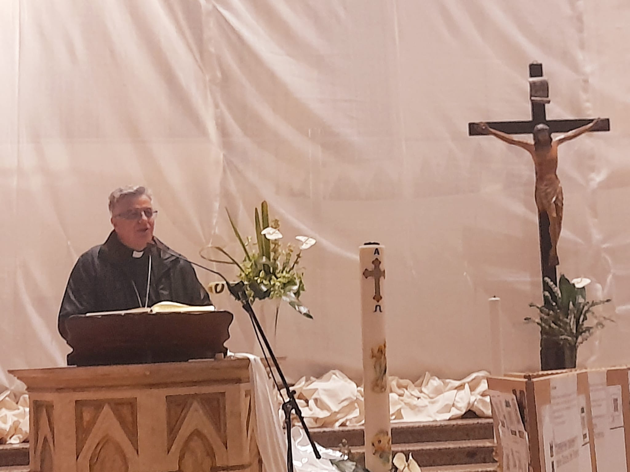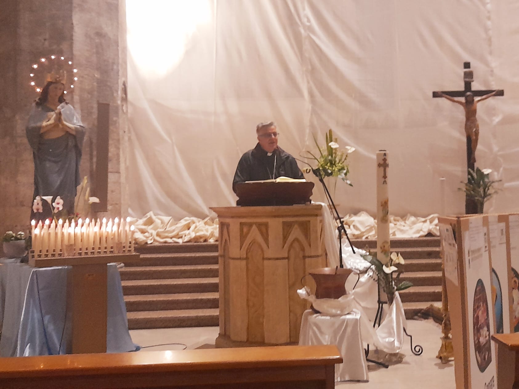 Queste le parole del vescovo Palmieri ai giovani presenti: “Nella tomba di Gesù succede qualcosa di nuovo, di straordinario. La Resurrezione di Gesù, infatti, non è la rianimazione del cadavere di Gesù, come era avvenuto per Lazzaro, che era morto, ma il suo cadavere è stato rianimato. No! La Resurrezione di Gesù è tutta un’altra cosa. Il corpo di Gesù scompare, sparisce. Cosa è successo? È come se Gesù avesse sfondato la porta della morte e fosse entrato per sempre nella vita di Dio. Gesù è il Dio che si è fatto uomo; dal mondo di Dio Gesù viene e ora, sfondando la porta della morte, entra nella vita di Dio. È la prima volta che un uomo sfonda la porta della morte. Nessun uomo ci è riuscito prima. Soltanto Dio fatto uomo, lo fa! La Resurrezione non è un cadavere che si rianima e non è nemmeno il fatto che Gesù ormai sia con me sempre. Cos’è allora la Resurrezione? Papa Benedetto ce lo ha spiegato bene: ci ha detto che, con la Resurrezione, la storia dell’uomo entra in una dimensione nuova, la dimensione di Dio, la dimensione dell’eternità. È come se ci fosse un cielo nuovo, una terra nuova, un uomo nuovo, una donna nuova, per l’eternità. Questo atto di risorgere con Dio e diventare con Lui una cosa sola, come fa Gesù – ci dice la Scrittura – può avvenire già adesso. Adesso! Con il Battesimo, tu sei già morto con Gesù e già vivo con Lui per sempre. Tu non sei fatto per la colpa, tu sei fatto per la vita. Per sempre. Hai già sfondato la porta della morte, sei già entrato nel Regno, sei già entrato nel giorno senza tramonto. Sei già diventato una persona luminosa. Ecco perché nella tomba ci sono due uomini vestiti di bianco. Questo è il nostro cammino: diventare uomini e donne vestiti di bianco, totalmente trasfigurati dalla Luce dello Spirito Santo, totalmente trasformati, fatti nuovi dalla luce di Gesù Risorto. Ed è così, perché, quando noi facciamo cambiare il cuore da Gesù, quando ci facciamo riempire di Spirito Santo e dalla Sua luce, quando indossiamo la veste bianca del Battesimo, quando diventiamo uomini nuovi, ecco che comincia già quaggiù la vita eterna. Quando parla della vita eterna, Gesù non si riferisce al Paradiso. Egli dice: ‘Chi crede in me avrà la vita eterna’. Significa che la vita eterna inizia qui e che è talmente bella che niente la può fermare. Noi allora siamo tutti chiamati a rinascere in Gesù, siamo tutti chiamati a mettere la veste bianca, a diventare uomini e donne nuovi, luminosissimi!“.