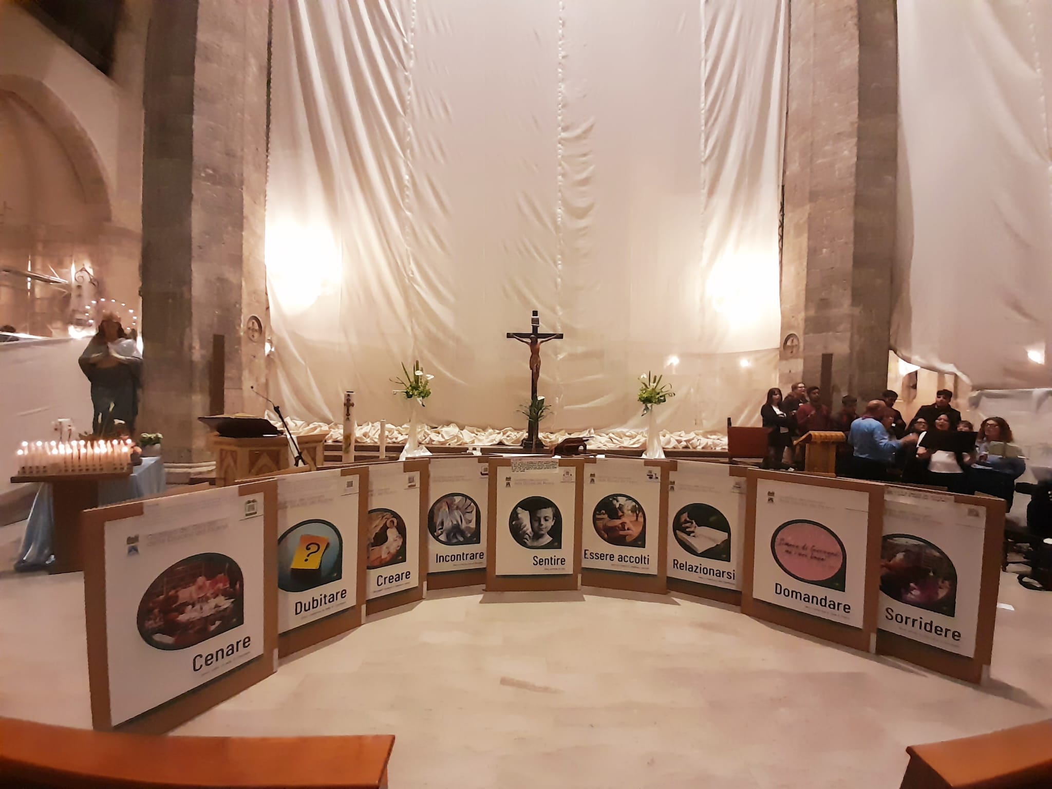 nella chiesa di San Pietro Martire, i giovani si sono cimentati in un laboratorio diretto da don Luca Censori sulla liturgia vissuta come cena, quindi come esperienza di incontro tra amici, tra fratelli, ispirati dalla cena condivisa dai discepoli di Emmaus.
