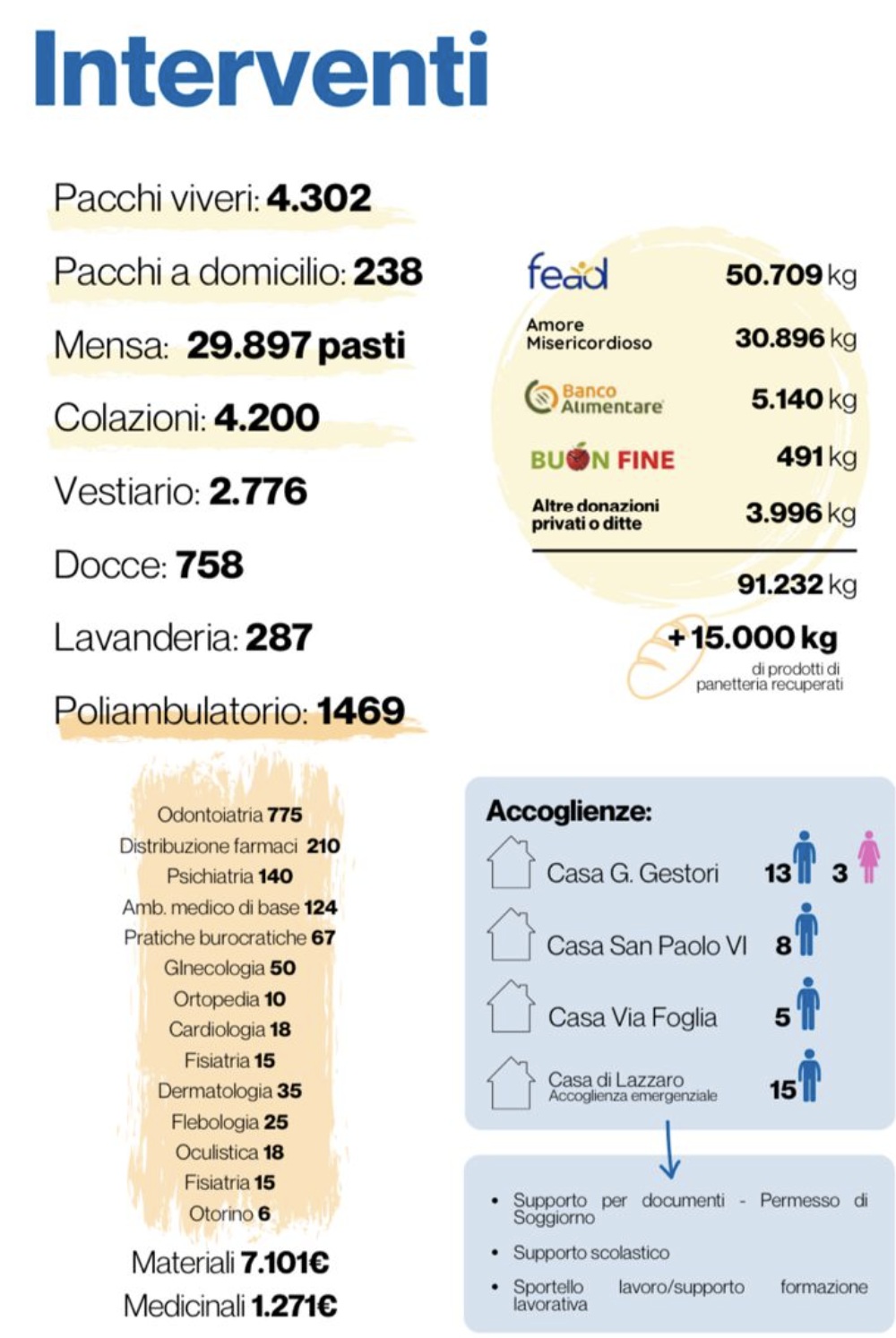 La Caritas, ogni giorno, fornisce centinaia di pasti, assistenza sanitaria, pacchi viveri, e accoglie persone vulnerabili in uno spazio che diventa essenziale per chi vive ai margini della società.
