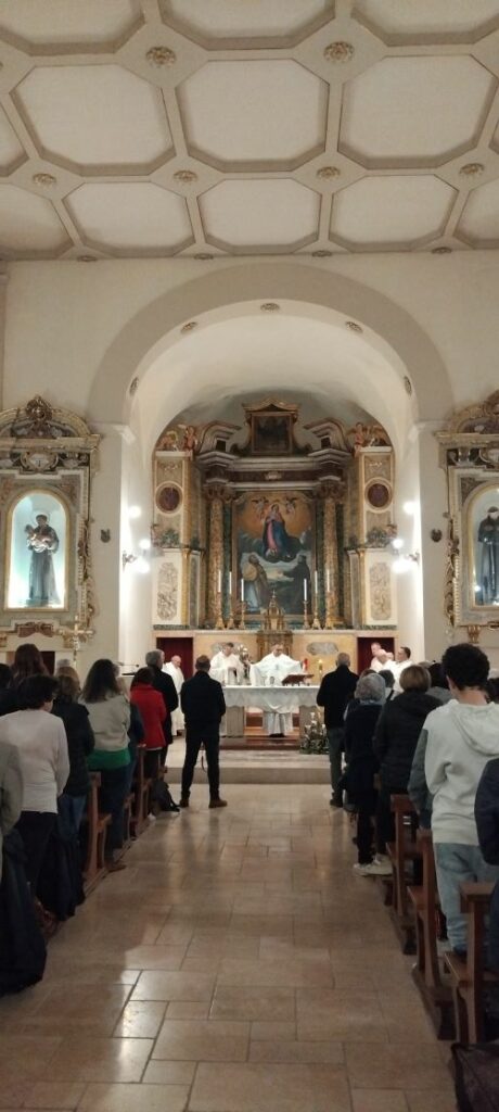 Prima della celebrazione, alle ore 17:30, numerosi fedeli e amici dei due sacerdoti, provenienti dalla parrocchia di Sant’Antonio da Padova in San Benedetto del Tronto, si sono ritrovati davanti al convento per un momento di visita e condivisione nel centro storico del paese. Nonostante la pioggia battente, l’atmosfera è rimasta gioiosa e raccolta, segno del profondo affetto verso padre Giancarlo e padre Gabriele.