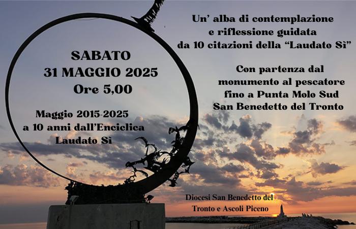 DIOCESI – Un’alba di contemplazione e riflessione nello splendido scenario naturale del lungomare di San Benedetto del Tronto, dal Monumento del Pescatore fino a Punta Molo Sud: è così che gli Uffici di Pastorale Sociale, del Lavoro e della Cura del Creato delle due Diocesi del Piceno hanno pensato di festeggiare il decimo anniversario dell’enciclica Laudato Si’ di papa Francesco, pubblicata il 24 Maggio 2015.