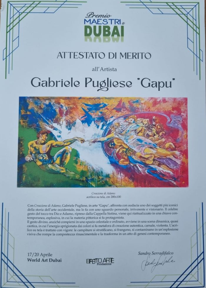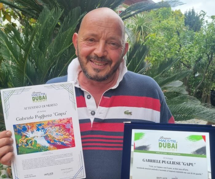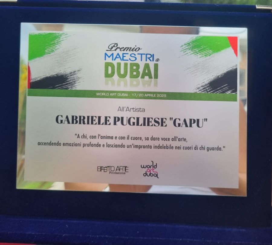 GROTTAMMARE – Il pittore Gabriele Pugliese, in arte GAPU, è stato premiato alla World Art Dubai 2025. L’artista ha ricevuto il premio Maestri a Dubai, il prestigioso riconoscimento è stato conferito dalla Fondazione Effetto Arte e consegnato durante la fiera World Art Dubai 2025, il giorno 20 aprile. Il premio celebra artisti che riescono a trasmettere, attraverso le proprie opere, emozioni profonde e un segno autentico nell’animo dello spettatore. Con la sua pittura espressiva , vivace e ricca di significato, GAPU ha saputo conquistare pubblico e critica internazionale. Il pittore ha ricevuto anche un attestato di merito a testimonianza della qualità e originalità del suo lavoro.