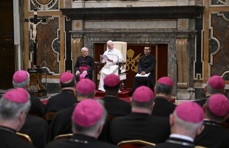 ha esordito il Papa a braccio, ribadendo le parole da lui pronunciate in una plenaria del Dicastero dei vescovi e citate dal card. Pietro Parolin, segretario di Stato Vaticano, che ha anche annunciato per domani un pranzo, “un momento conviviale”, dei presenti insieme al Santo Padre, il quale nel corso dell’incontro ha donato a ciascuno di loro un anello con la scritta “sub umbra Petri”.