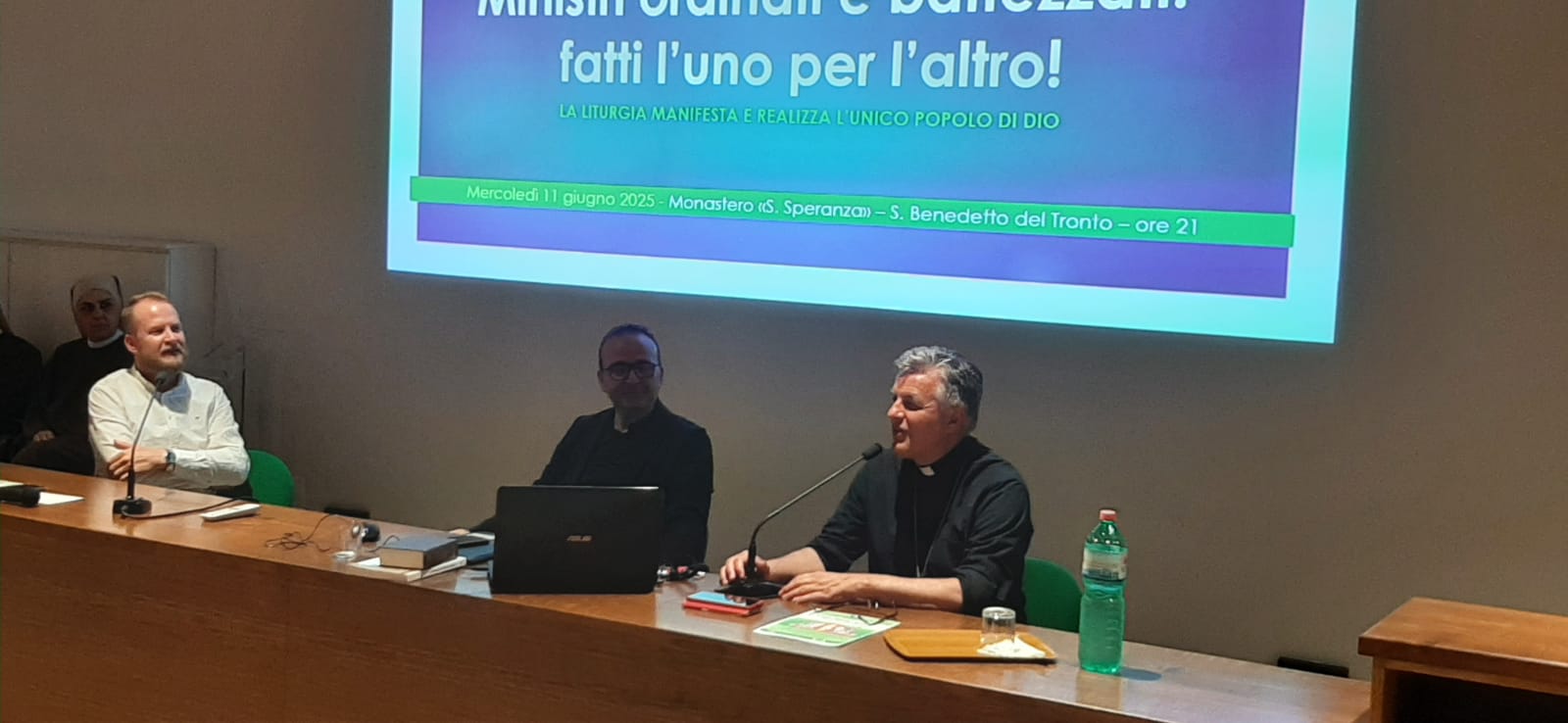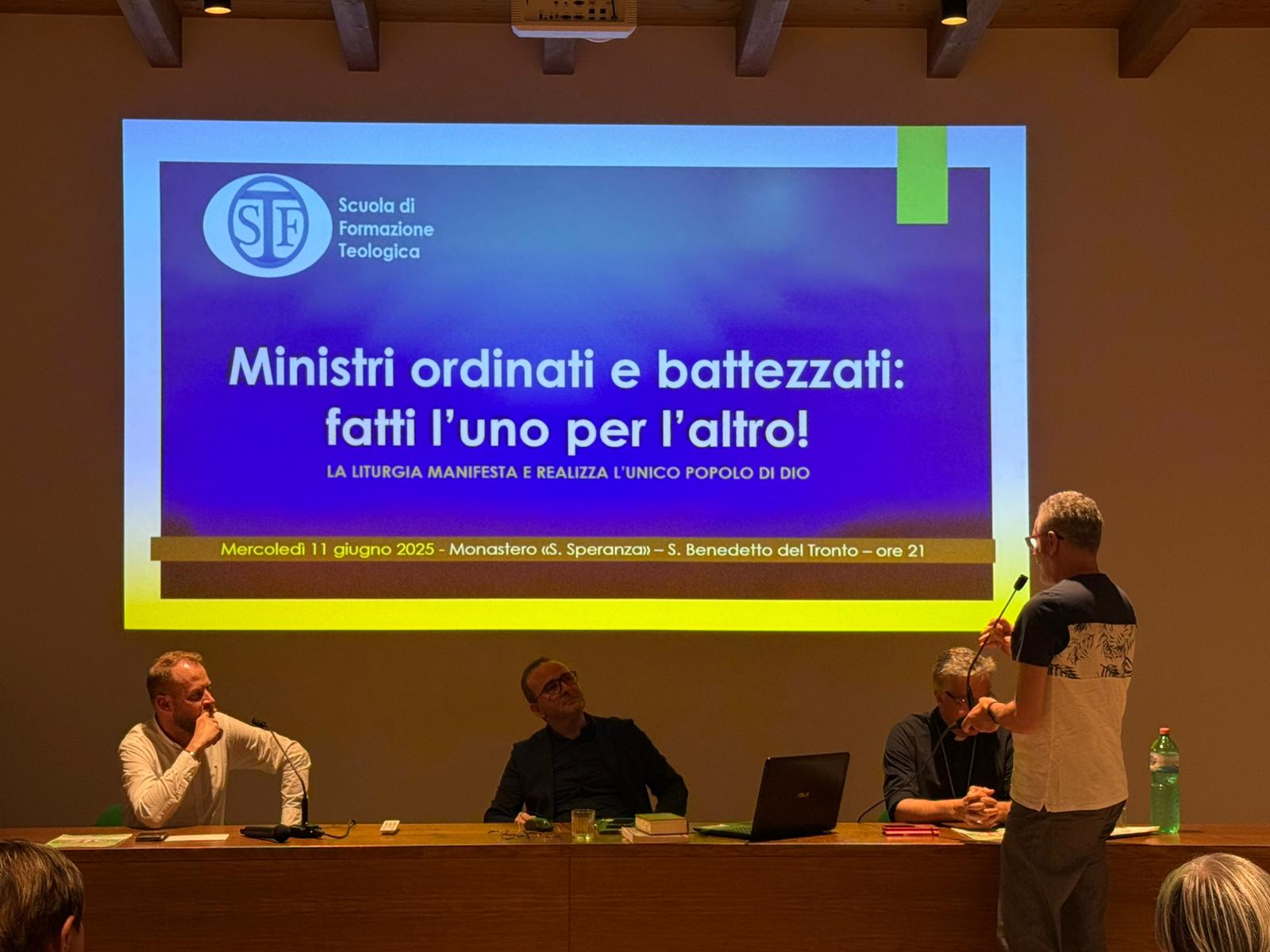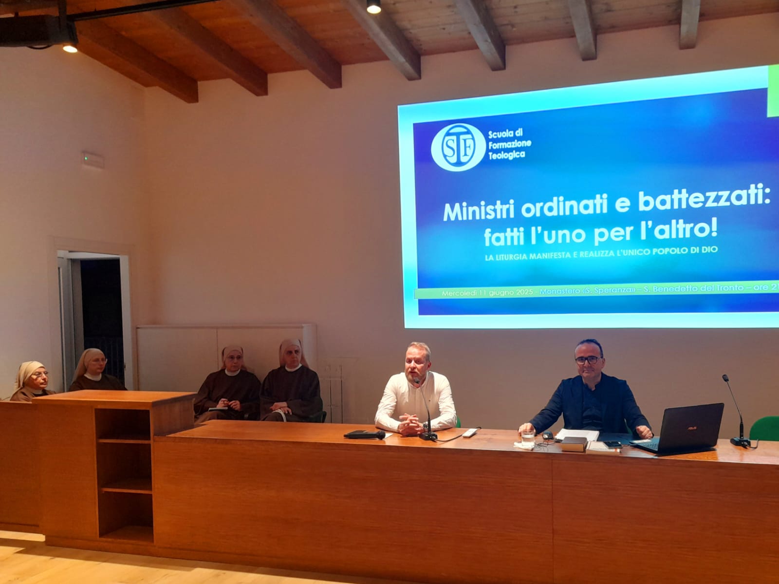 È con queste parole che don Gian Luca Pelliccioni, presbitero della Diocesi di San Benedetto del Tronto – Ripatransone – Montalto e docente di Teologia Fondamentale presso la Scuola di Formazione Teologica, ha iniziato il suo intervento durante l’incontro dal titolo “Ministri ordinati e battezzati: fatti l’uno per l’altro!”, che si è tenuto Mercoledì 11 Giugno, alle ore 21:00, presso la suggestiva cornice del monastero Santa Speranza, in San Benedetto del Tronto. Il sottotitolo – “La liturgia manifesta e realizza l’unico popolo di Dio” – svela quale sia stato il tema al centro della serata.