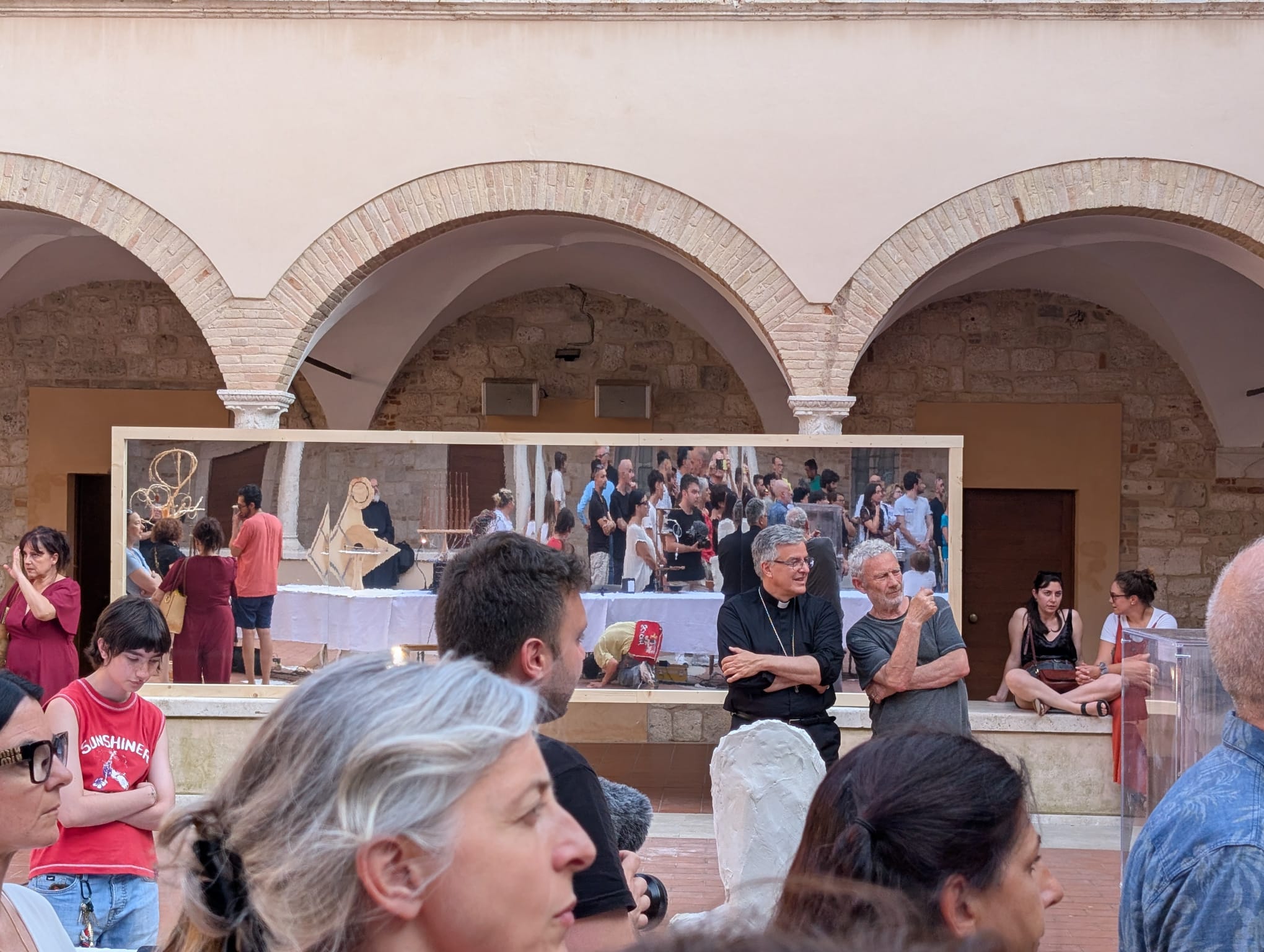 “L’obiettivo – dichiara don Matteo Mantenuto – era quello di far sì che le persone si conoscessero meglio, si mettessero in dialogo, si confrontassero. E così è stato. Il nostro chiostro è diventato luogo di incontro e di ascolto reciproco. Durante gli appuntamenti preparatori, organizzati per valutare gli spazi e per effettuare dei laboratori di pittura, ci sono stati anche momenti significativi di riflessione. Le attività hanno coinvolto principalmente adulti ed adolescenti, i quali hanno dipinto dei cubi che poi sono divenuti parte dell’opera. Ma la cosa più importante è che, prima di realizzarli, abbiamo analizzato la figura degli apostoli: ci siamo chiesti chi siano e come si evolva la loro vita dopo l’incontro con Gesù. Poi abbiamo approfondito il tema dell’ultima cena e quale sia il suo significato. Il confronto, aperto e alla pari, è stato fecondo: pur partendo da prospettive diverse, tutti abbiamo avuto uno sguardo orientato verso la speranza“.