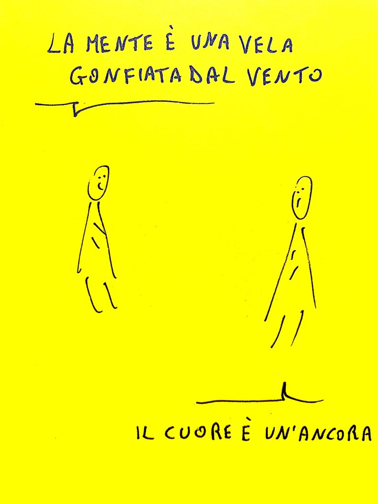 “La pietra che i costruttori hanno scartato è diventata pietra angolare”, recitano i Salmi. Sànpert disegna uno stare al mondo. È il palpitare di uno spirito che si nasconde ovunque, fra le lacrime di un bambino innocente o nei rantoli di un fiore appena spezzato. La sua voce, spesso afona e graffiata, è un crocevia di anime dolenti, di storie dimenticate, di mormorii che si dissolvono nel caos tenero e fragile dell’umanità. Ogni tavola è una ferita aperta, ogni parola un sussurro che lacera il silenzio.