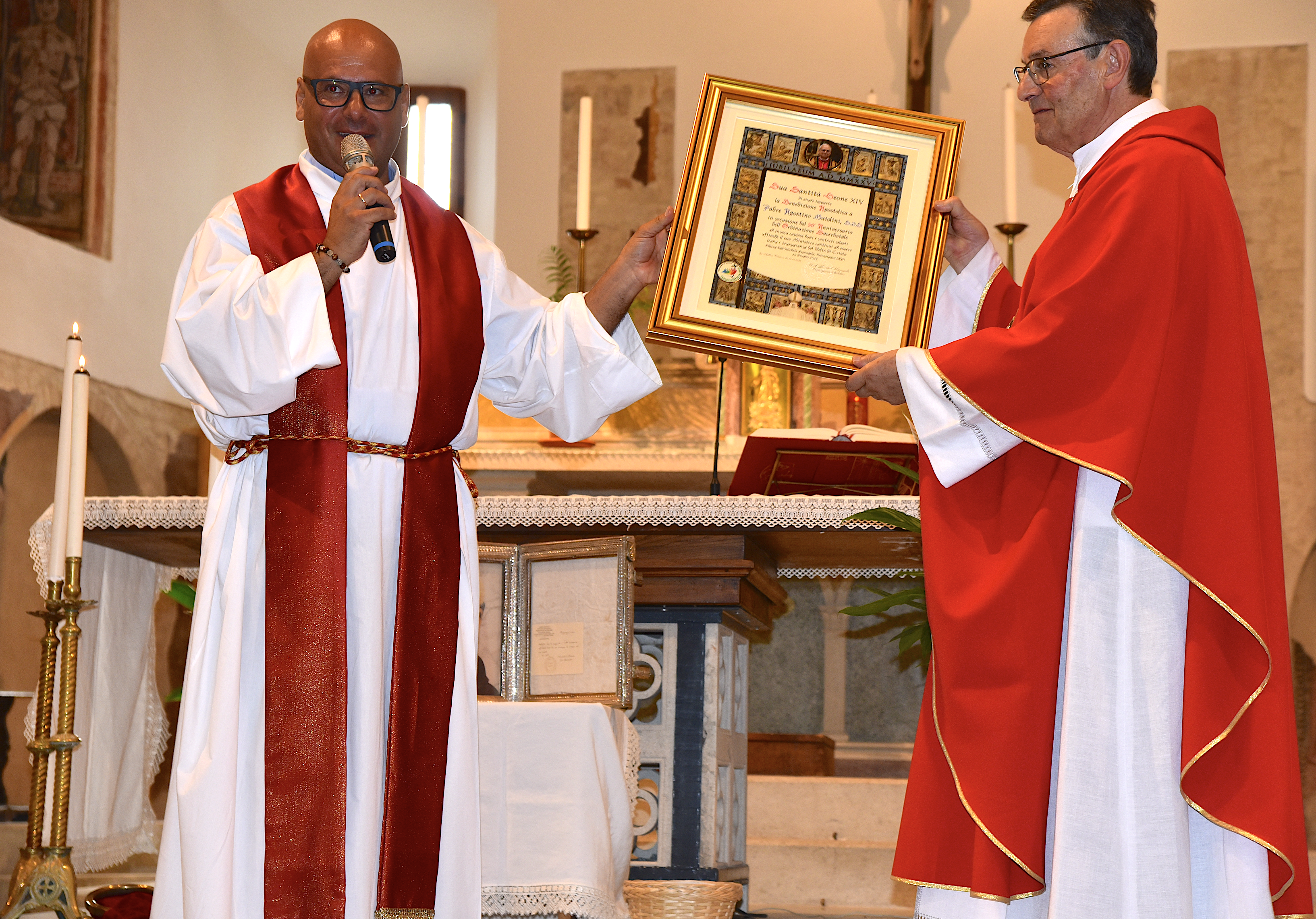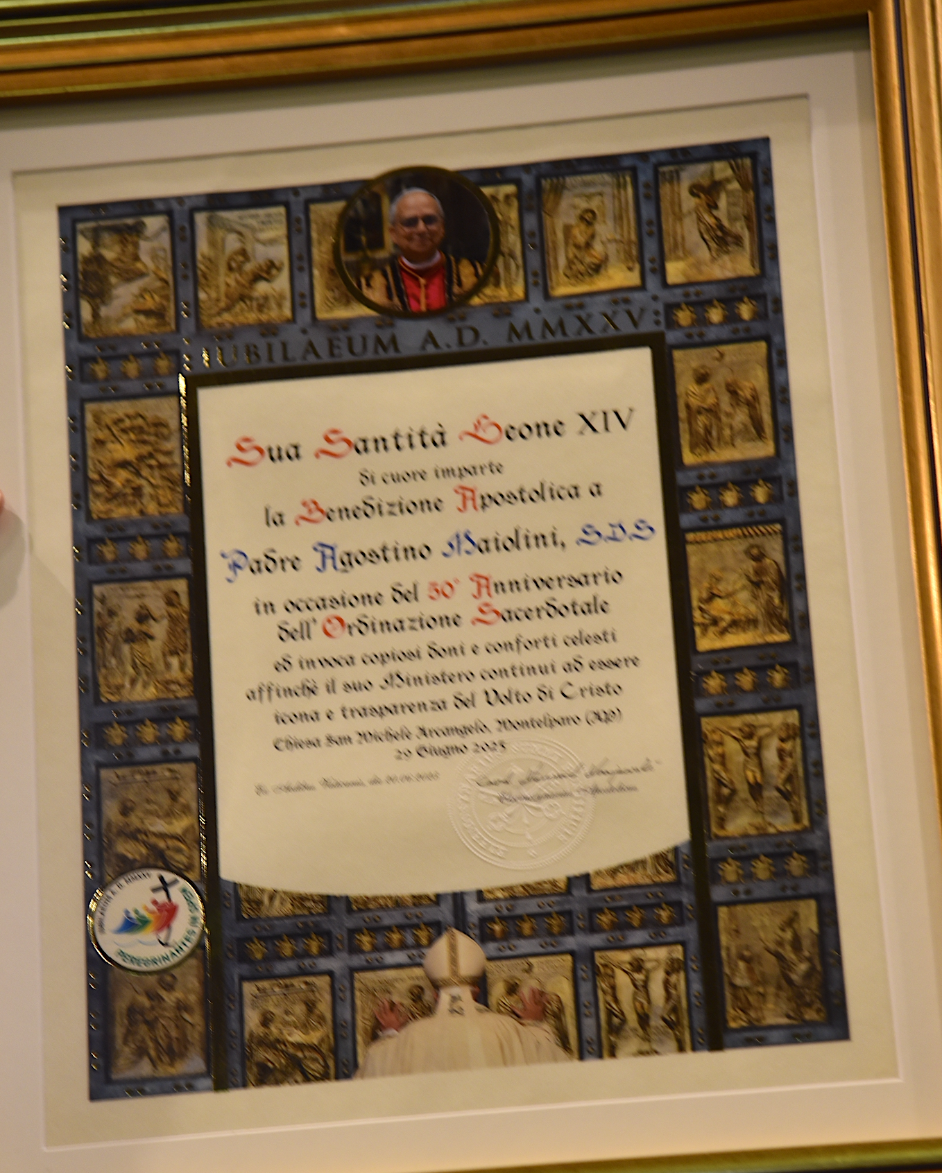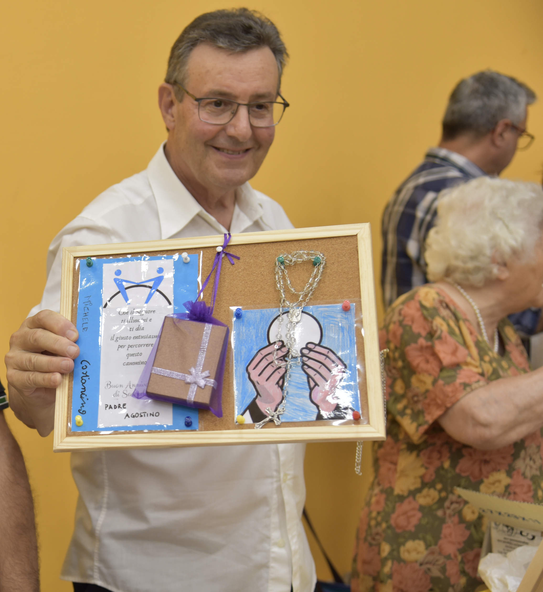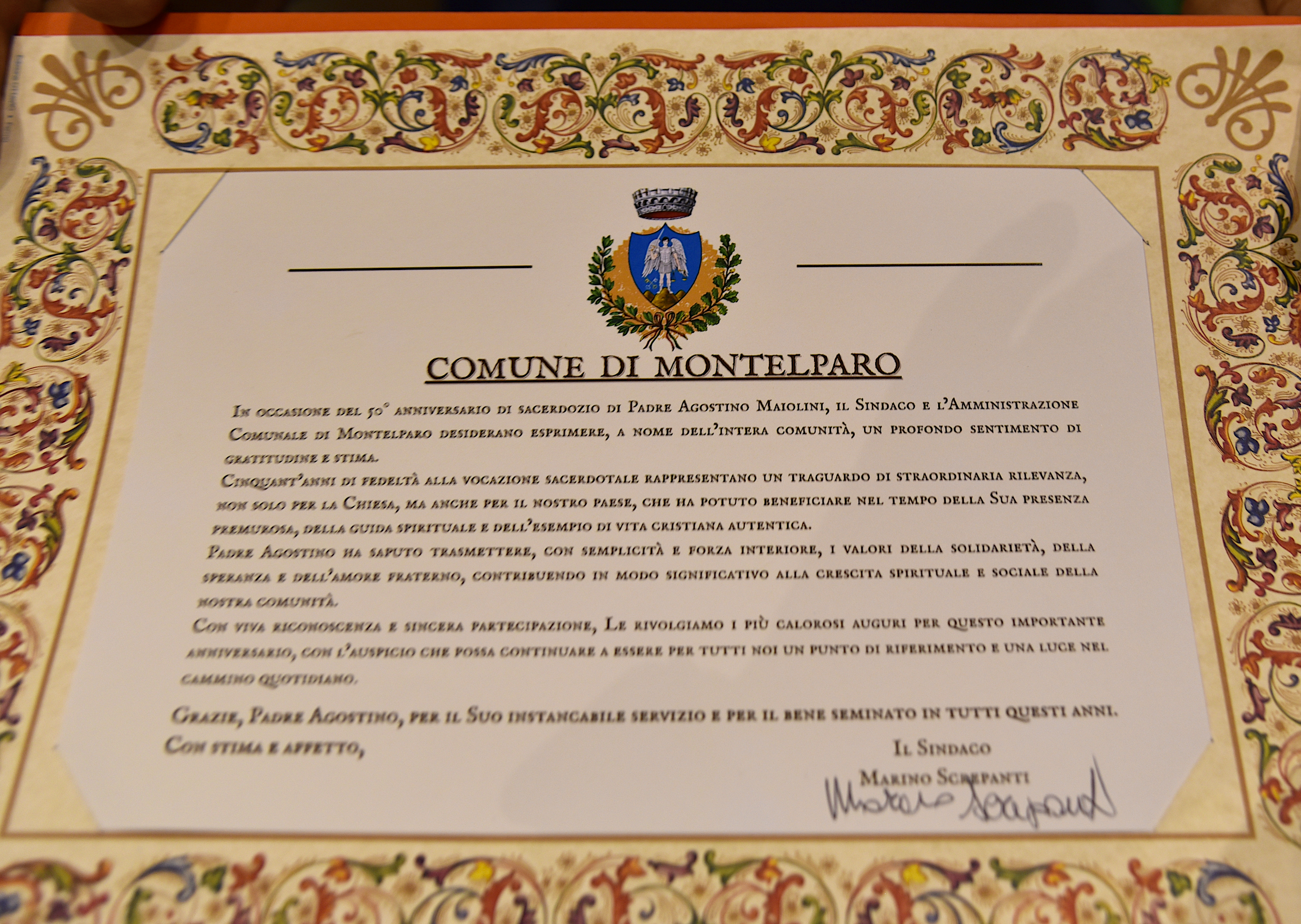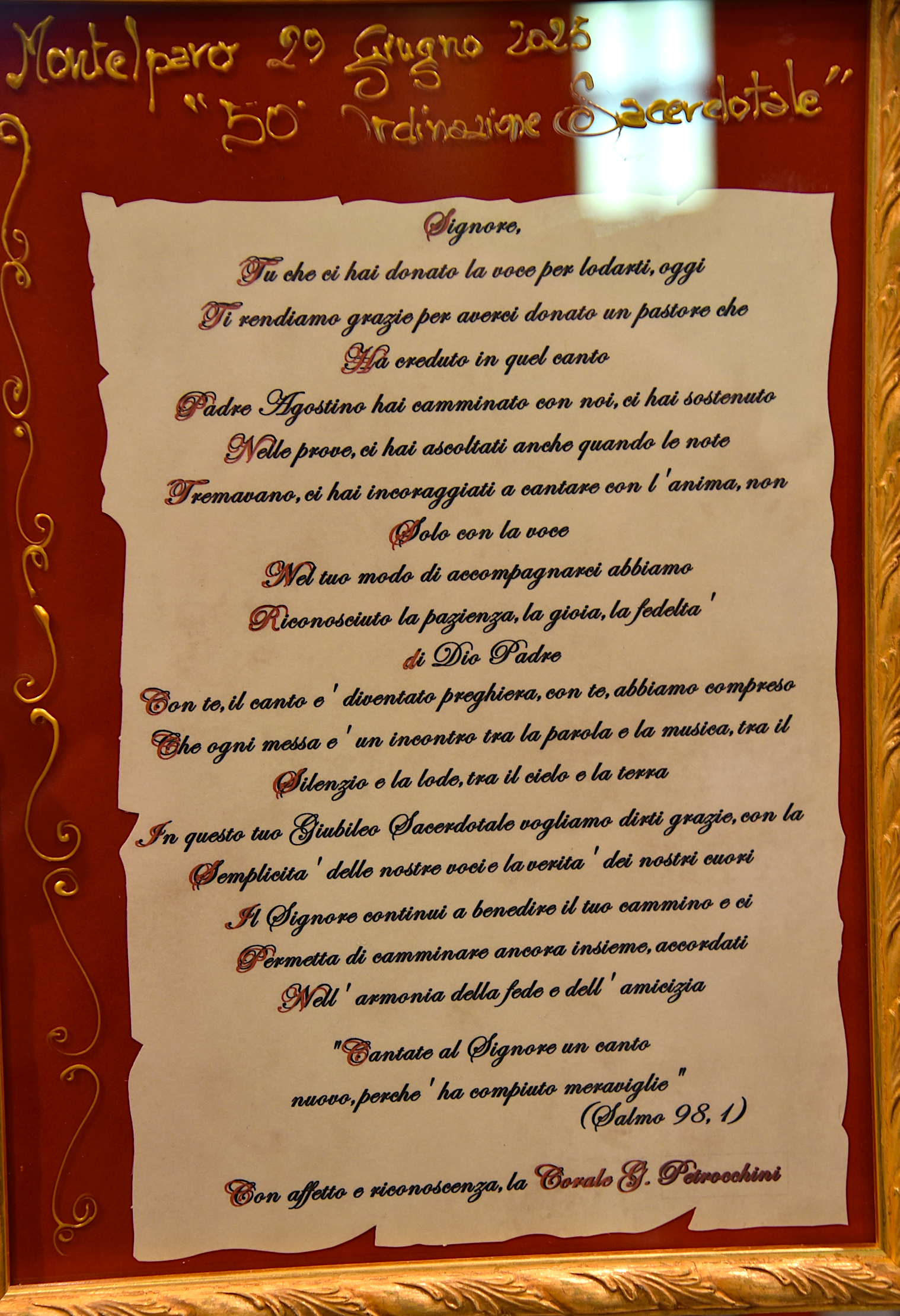 Tutto questo iniziava dai ricordi, proposti con molta partecipazione da Irene Gaeta. C’è stato poi il saluto del Sindaco di Montelparo Marino Screpanti e del rappresentante della Corale che hanno donato a Padre Agostino bellissimi quadri ricordo. Anche Sua Santità Papa Leone XIV ha voluto sottolineare l’importanza dell’evento inviando a Padre Agostino un suo bellissimo quadro con dedica!