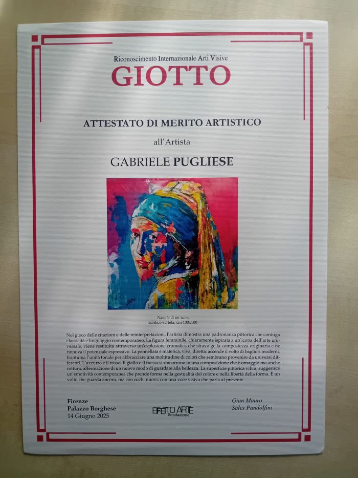 GROTTAMMARE – Reduce dal successo internazionale alla World Art Dubai 2025, l’artista Gabriele Pugliese – in arte GAPU – conquista anche la scena italiana ricevendo a Firenze il prestigioso Premio Giotto per la sua opera “Ragazza con l’orecchino astratto”.