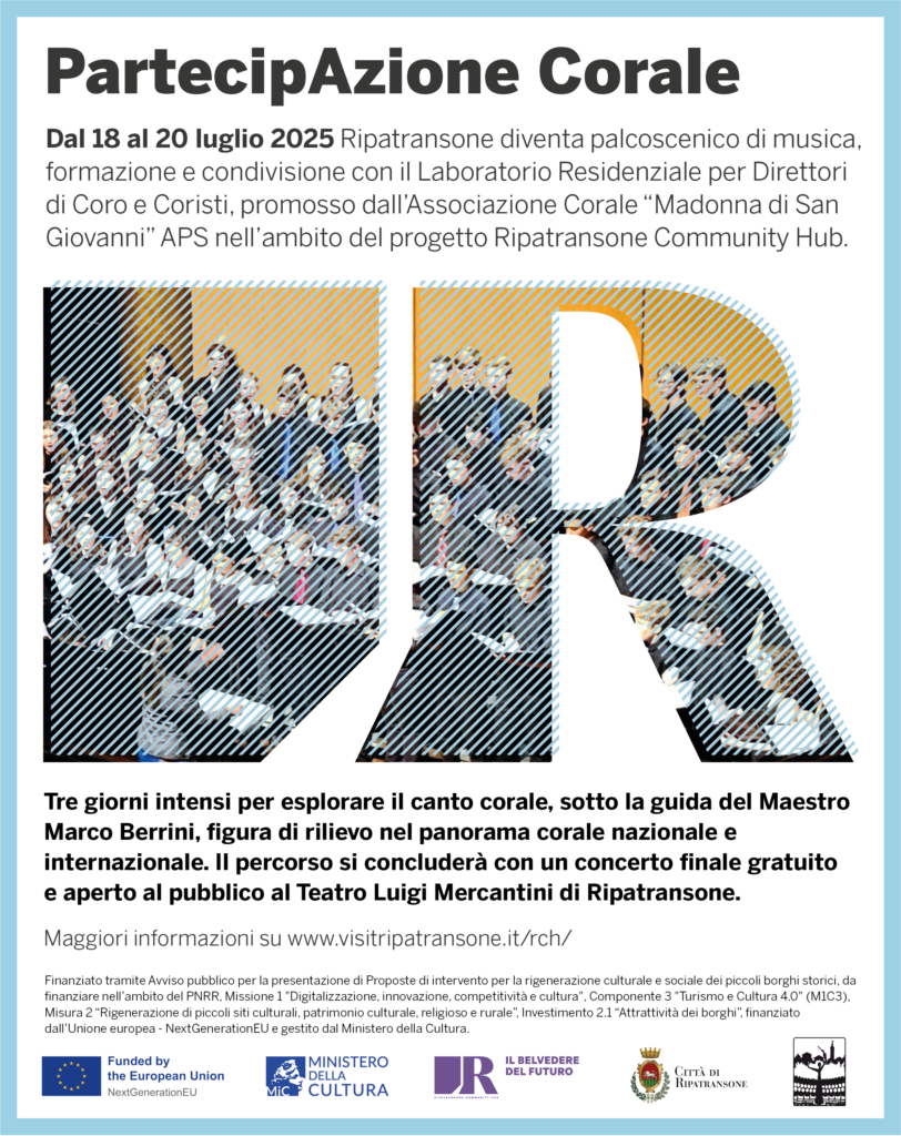 RIPATRANSONE – Dal 18 al 20 luglio 2025 Ripatransone si prepara a diventare centro di cultura musicale grazie al Laboratorio Residenziale per Direttori di Coro e Coristi, organizzato dall’Associazione Corale “Madonna di San Giovanni” APS nell’ambito dell’intervento “PartecipAzione Corale”, realizzato all’interno del progetto Ripatransone Community Hub (RCH) promosso dal Comune di Ripatransone.