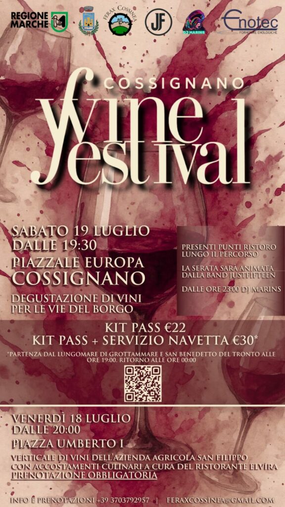 Un appuntamento da non perdere quindi, che unirà il gusto del buon vino marchigiano alla scoperta di un incantevole borgo medievale. Per avere informazioni o preservare con certezza l’ingresso agli eventi basta contattare il 3703792957 o scrivere all’indirizzo E-mail feraxcossinea@gmail.com.