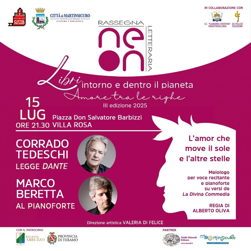 Il 15 luglio alle ore 21.30 a Villa Rosa (piazza Don Salvatore Barbizzi) l’attore Corrado Tedeschi e il pianista Marco Beretta daranno vita a L’amor che move il sole e l’altre stelle, melologo per voce recitante e pianoforte su versi della Divina Commedia, con la regia di Alberto Oliva.