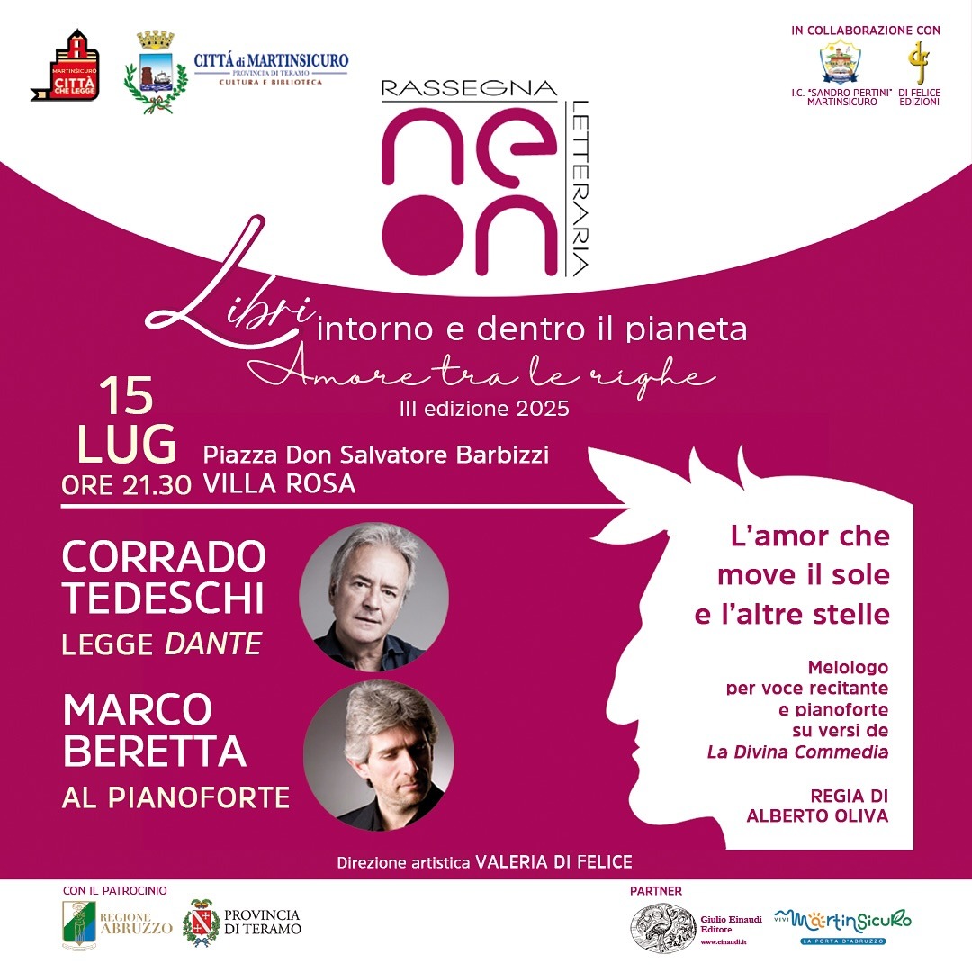 Il 15 luglio alle ore 21.30 a Villa Rosa (piazza Don Salvatore Barbizzi) l’attore Corrado Tedeschi e il pianista Marco Beretta daranno vita a L’amor che move il sole e l’altre stelle, melologo per voce recitante e pianoforte su versi della Divina Commedia, con la regia di Alberto Oliva.