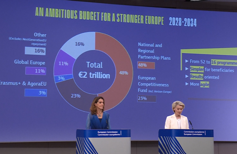 Nuovo è il programma AgoraEu, finalizzato a promuovere valori condivisi, tra cui democrazia, uguaglianza e Stato di diritto, e a sostenere la diversità culturale europea, i settori audiovisivo e creativo, la libertà dei media e il coinvolgimento della società civile. Resta Erasmus+ con un aumento di risorse del 50%. Altro elemento di novità è l’introduzione di un meccanismo dedicato alla risposta delle crisi con 400 miliardi di euro perché – spiega von der Leyen – “abbiamo imparato che le crisi sono la regola. Saranno soldi disponibili, con forti salvaguardie in casi di crisi ignote in questo momento”. Rispetto alle risorse destinate all’azione esterna e per far fronte alle responsabilità sulla scena globale, saranno pronti 200 miliardi di euro del programma “Europa globale”, del valore di 200 miliardi di euro per il periodo 2028-2034. Accanto a questi, l’Ue mette in conto un sostegno per la ricostruzione dell’Ucraina per 100 miliardi di euro. Non aumenteranno i contributi nazionali al bilancio dell’Ue, ha assicurato la Presidente, ma l’Ue si doterà di strumenti per garantire risorse proprie (scambio di quote di emissione, meccanismo di adeguamento del carbonio alla frontiera, aliquota sui rifiuti elettronici non raccolti, accisa sui prodotti del tabacco) per coprire i costi previsti nel nuovo Qfp. Un punto resta fermo: “per ottenere risorse europee gli Stati membri dovranno garantire il rispetto dei principi dello Stato di diritto e della Carta dei diritti fondamentali”. “Questa proposta ha il sostegno forte del Collegio dei commissari”, ha concluso la Presidente, ma “ora dovremo lottare per difenderlo”. Inizia infatti ora il tempo del negoziato con Stati membri e Parlamento, che ha già espresso le proprie contrarietà. Per von der Leyen si tratta di “comprensibili reazioni alla novità delle proposte”.