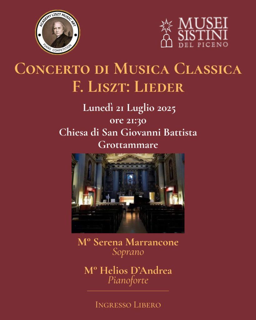 GROTTAMMARE – Nella meravigliosa cornice della Chiesa di San Giovanni Battista, sede del Museo Sistino del Piceno, si terrà un raffinato Concerto di Musica Classica dedicato alle Lieder di Franz Liszt. L’appuntamento è per questa sera, lunedì 21 luglio alle ore 21:30, un’occasione imperdibile per gli amanti della musica romantica.