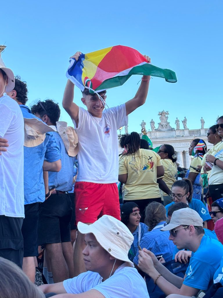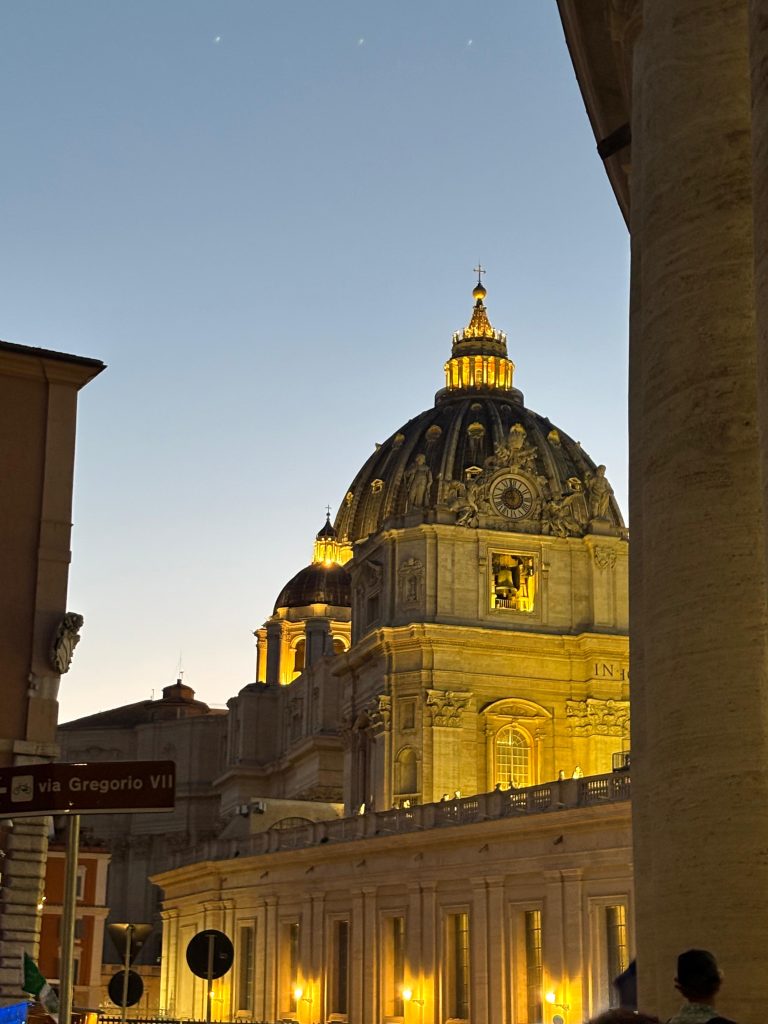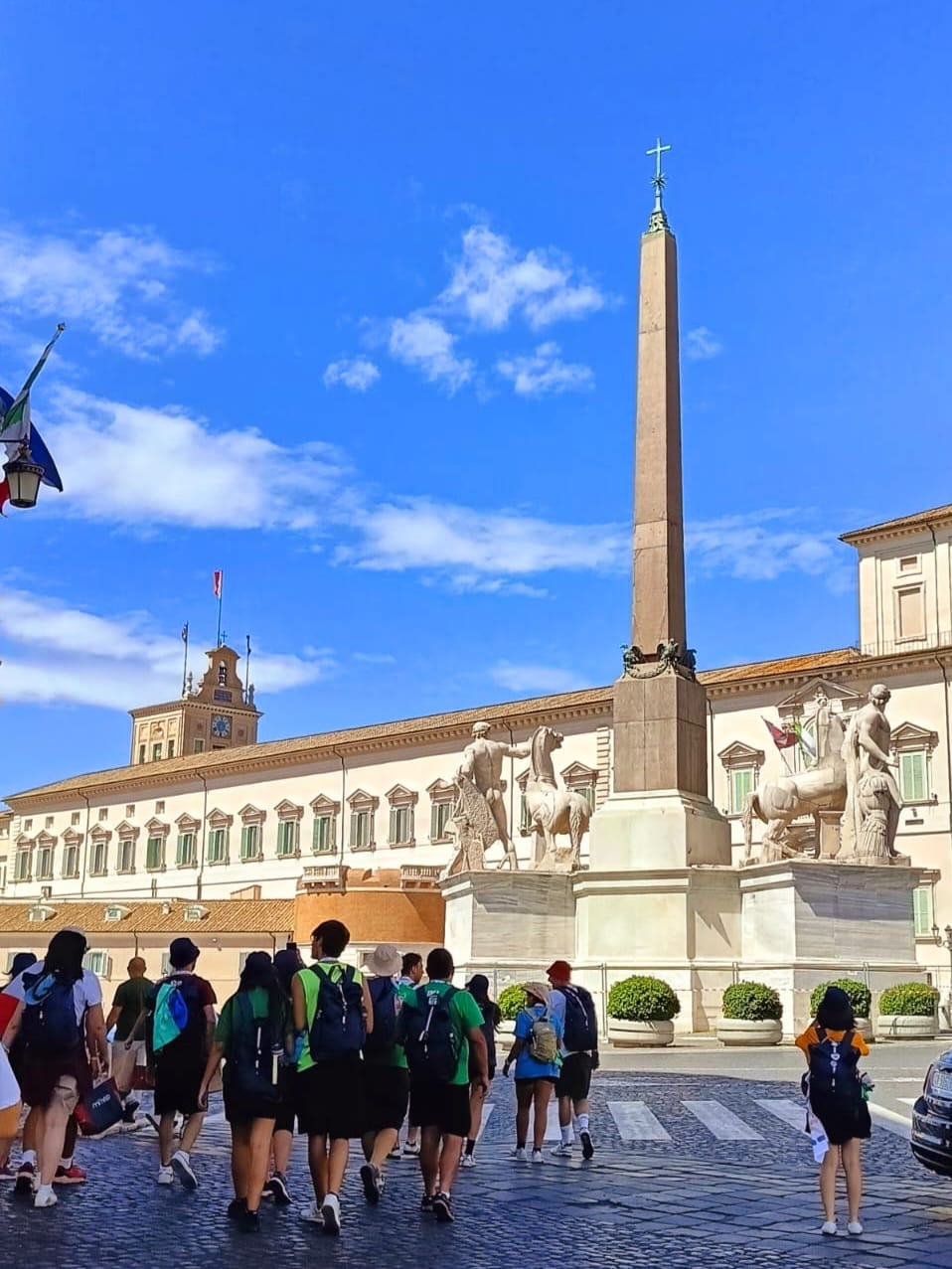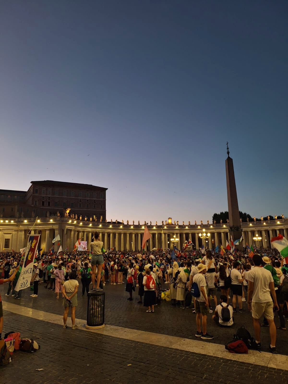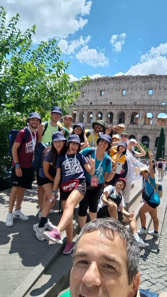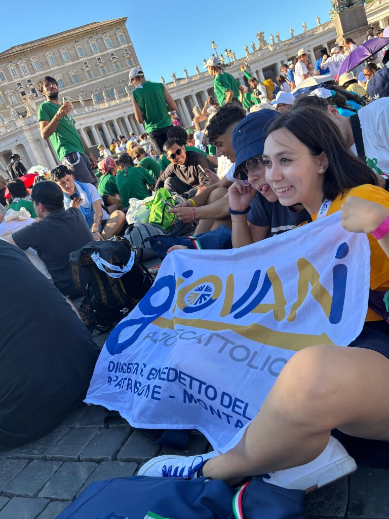 “Nel pomeriggio – prosegue Leonardo -, abbiamo preso la metro per raggiungere Roma, dove abbiamo visitato due chiese molto significative, legate a due giovani che presto verranno proclamati Santi: la chiesa di San Marcello al Corso, dove è ospitata una reliquia del beato Carlo Acutis, e la chiesa di Santa Maria Sopra Minerva, dove sono state traslate le spoglie del beato Pier Giorgio Frassati. Infine, dopo aver ammirato alcuni monumenti e palazzi della capitale, ci siamo recati a San Pietro per vivere insieme a tanti altri giovani la Messa di benvenuto presieduta da mons. Rino Fisichella. Anche qui è tornato il tema della sete e il monito a rispondere con amore e carità a chi è nella necessità, a dare certezza alla speranza che l’amore vince sempre, che la bontà supera la violenza, che abbiamo bisogno di essere costruttori di pace ogni giorno. Ci ha detto che, se noi costruiamo la pace, il mondo avrà la pace“.