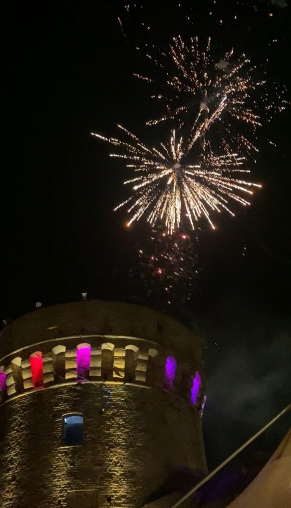 Momento particolarmente suggestivo è stato quando l’acquavivano Davide Spaccasassi ha regalato al pubblico presente uno spettacolo da brividi camminando su di una fune di due centimetri sospeso tra il Mastio e la Torre. A fine esibizione, accompagnata da un silenzio incredibile, l’artista che ha tenuto tutti con il fiato sospeso, ha strappato un fragoroso applauso.