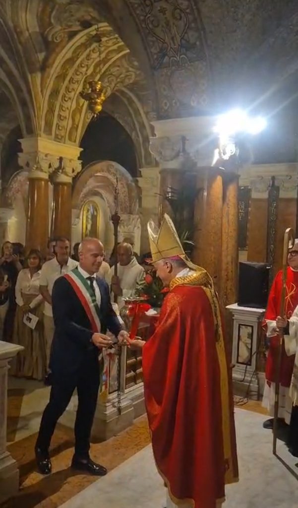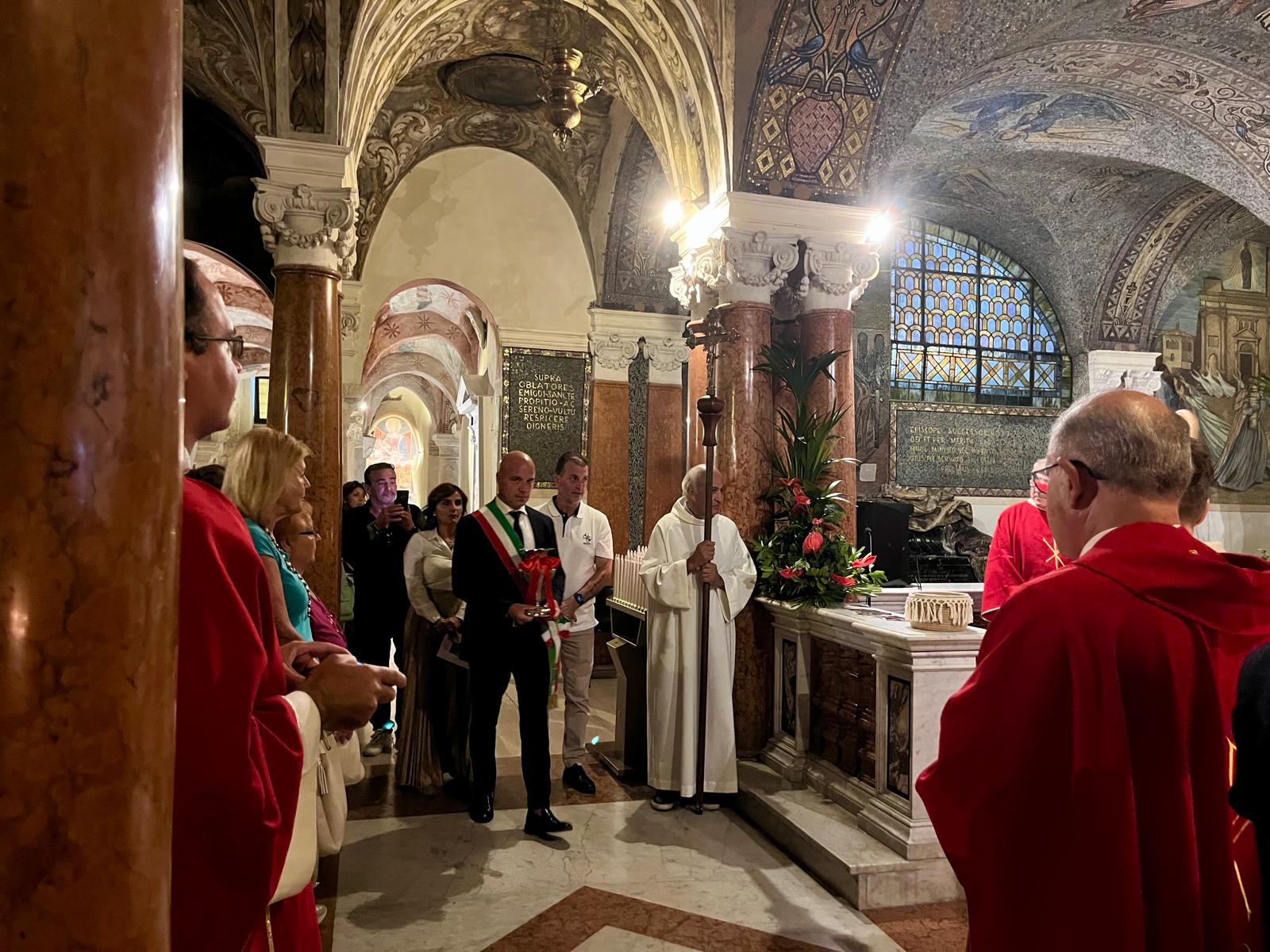 Al termine della Messa, il vescovo, insieme ai rappresentanti istituzionali e ai fedeli, è sceso nella cripta per accendere solennemente la lampada sulla tomba di Sant’Emidio. La consegna dell’olio da parte del primo cittadino di Valle Castellana suggella un gesto di fede e di unità ecclesiale.