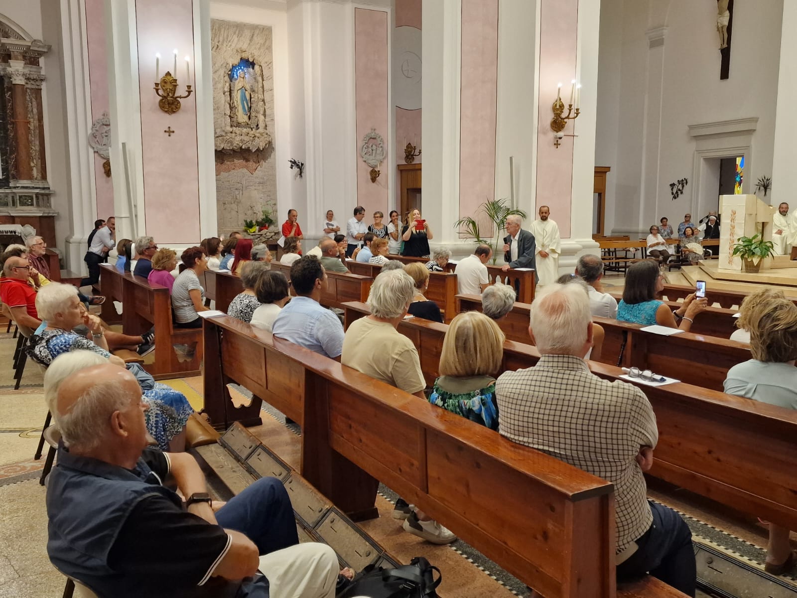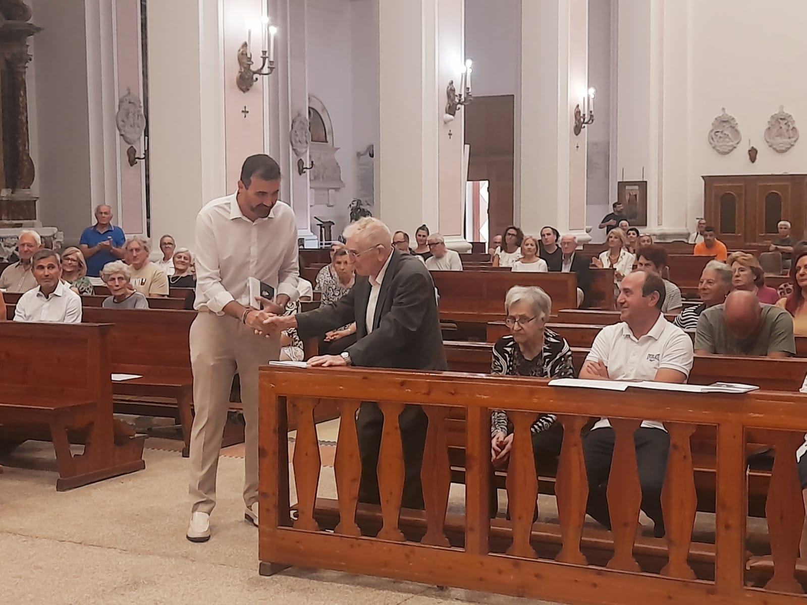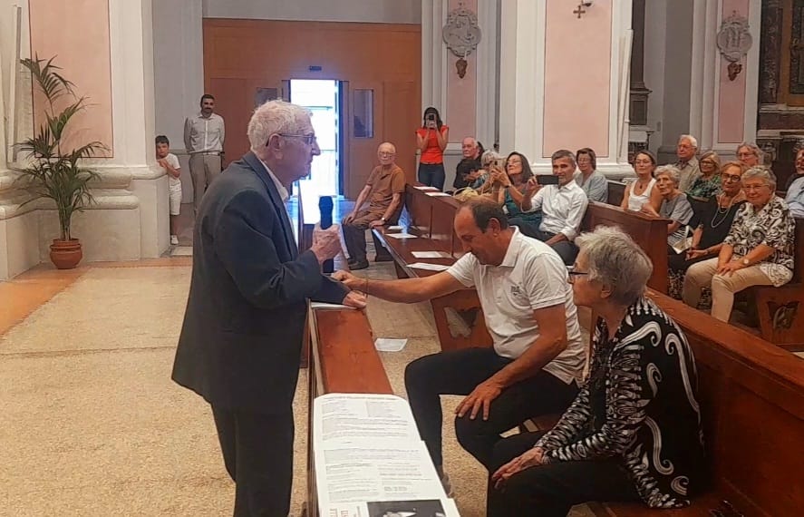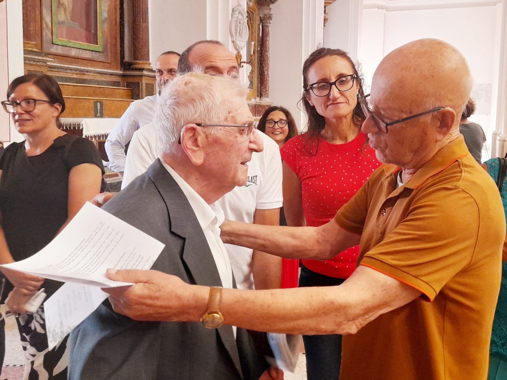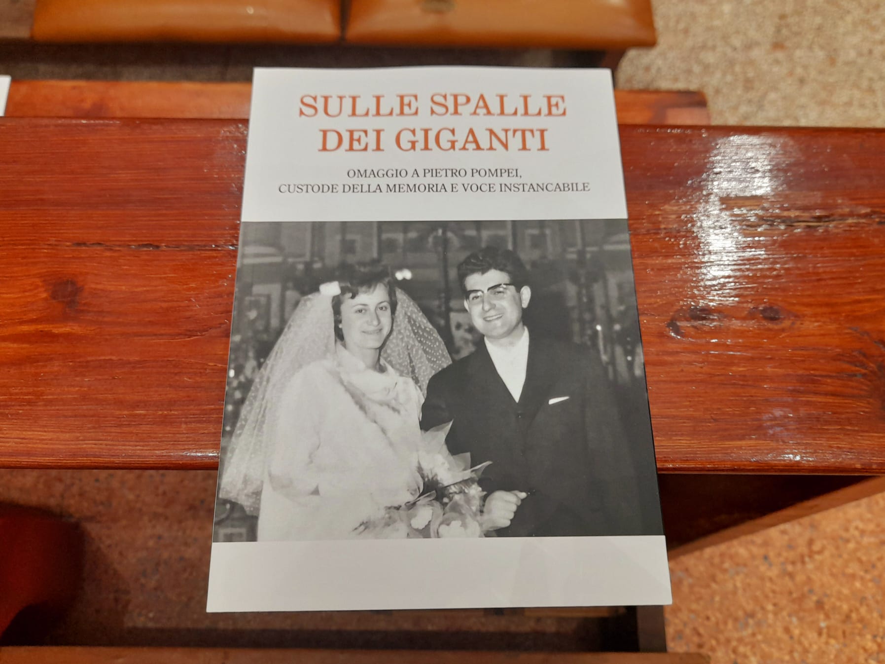 Dopo i riti di Comunione, il direttore responsabile de L’Ancora, Simone Incicco, ha voluto manifestare l’affetto, la stima e la gratitudine della comunità al prof. Pietro Pompei, donando al festeggiato una pubblicazione dal titolo “Sulle spalle dei giganti – Omaggio a Pietro Pompei, custode della memoria e voce instancabile“. Ha detto Incicco: “Caro Pietro, ci sono momenti nella vita in cui le parole si fanno dono, carezza, gratitudine. Il tuo 90° compleanno è uno di questi. E questa pagina vuole essere non solo un augurio, ma un abbraccio corale, un segno tangibile dell’affetto e della riconoscenza che ti circondano. Da tempo, con alcuni amici e colleghi, sentivamo il desiderio di raccogliere ciò che rappresenti per la nostra comunità. È nato così questo libro, che riunisce lettere, pensieri, ricordi, poesie, testimonianze. Tante voci diverse che si ritrovano unite da un sentimento comune: la stima profonda verso un uomo che ha speso la sua vita intrecciando cultura e fede, parola e servizio, memoria e speranza.