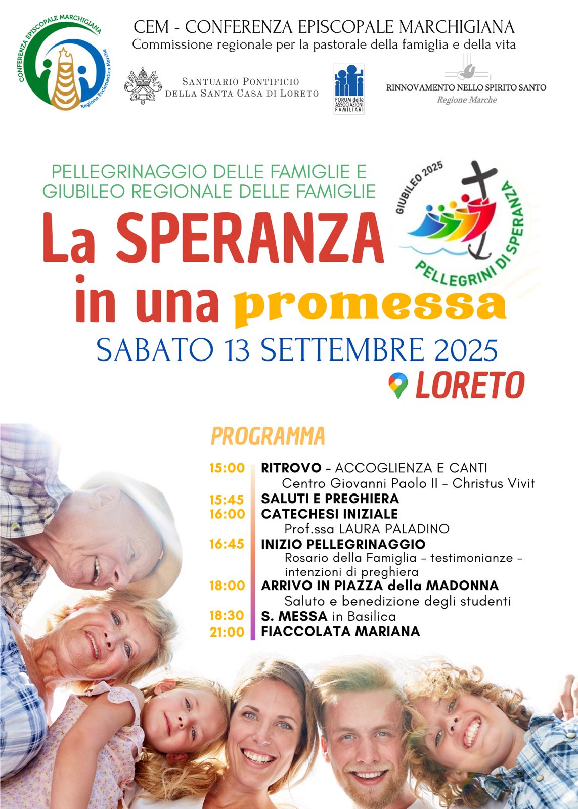 LORETO – In occasione dell’Anno Giubilare della speranza, la Commissione Regionale di Pastorale Familiare Marche e il Santuario Pontificio della Santa Casa di Loreto, organizzano il Giubileo Regionale delle Famiglie. L’evento si unisce al Pellegrinaggio delle famiglie che annualmente viene proposto dal Rinnovamento nello Spirito Santo Marche, con la collaborazione del Forum delle associazioni familiari Marche.