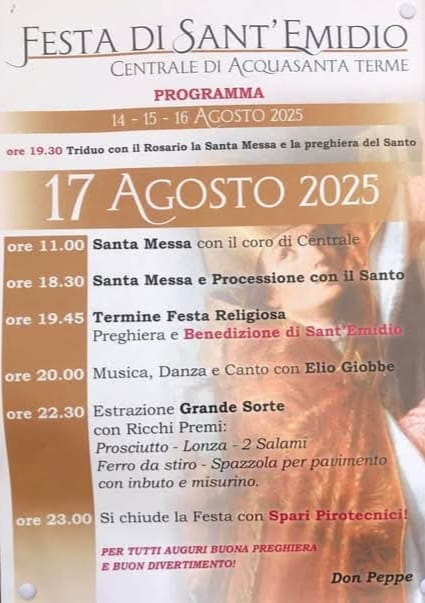 ACQUASANTA TERME – Oggi, Domenica 17 Agosto 2025, alle ore 18:30, presso la chiesa di Centrale in Acquasanta Terme, mons. Gianpierio Palmieri, vescovo delle Diocesi del Piceno, presiederà una Celebrazione Eucaristica in onore del patrono Sant’Emidio a cui sono intitolate sia la chiesa che la parrocchia. A concelebrare la Santa Messa sarà il parroco don Giuseppe Tanziani.