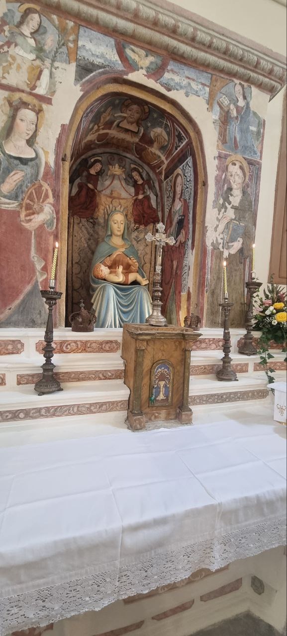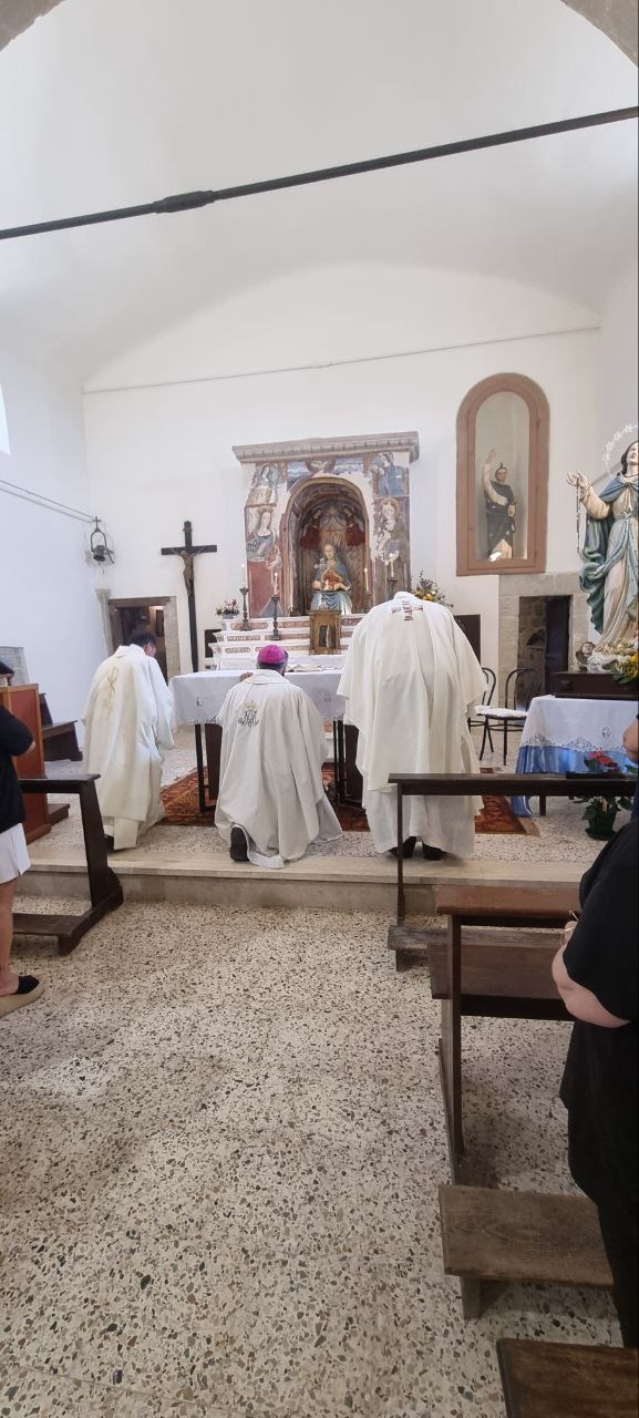 “Non è infrequente trovare nelle chiese del nostro territorio affreschi o quadri di pittori importanti, anche se a me commuove sempre trovare affreschi di pittura popolare, di non particolare pregio artistico, ma di grande testimonianza di fede. Non è infrequente, in queste raffigurazioni popolari, qualche invenzione artistica un po’ originale che testimonia la fede del popolo. Santa Maria di Scalelle è accompagnata dall’immagine, che non è antica ma tradizionale, di Maria che sulle ginocchia ha il bambino in una posizione delicata: non tocca il bambino con le mani, ma è come se lo contemplasse” — ha aperto così la sua omelia il Vescovo Gianpiero.