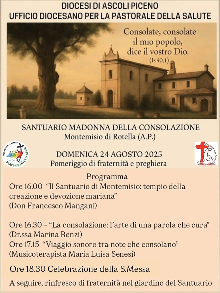 DIOCESI – “Consolate, consolate il mio popolo, dice il vostro Dio“: è questo verso del profeta Isaia (Is 40,1) che dà il titolo al pomeriggio di fraternità e preghiera che si terrà Domenica 24 Agosto 2025 presso il santuario Madonna della Consolazione in Montemisio di Rotella.