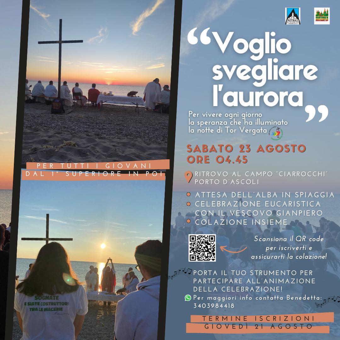L’iniziativa, dal titolo “Voglio svegliare l’aurora – Per vivere ogni giorno la speranza che ha illuminato la notte di Tor Vergata”, si terrà Sabato 23 Agosto 2025, alle ore 4:45 e fino alle ore 8:30 circa, nell’incantevole cornice della spiaggia antistante la Riserva Naturale della Sentina in Porto d’Ascoli.