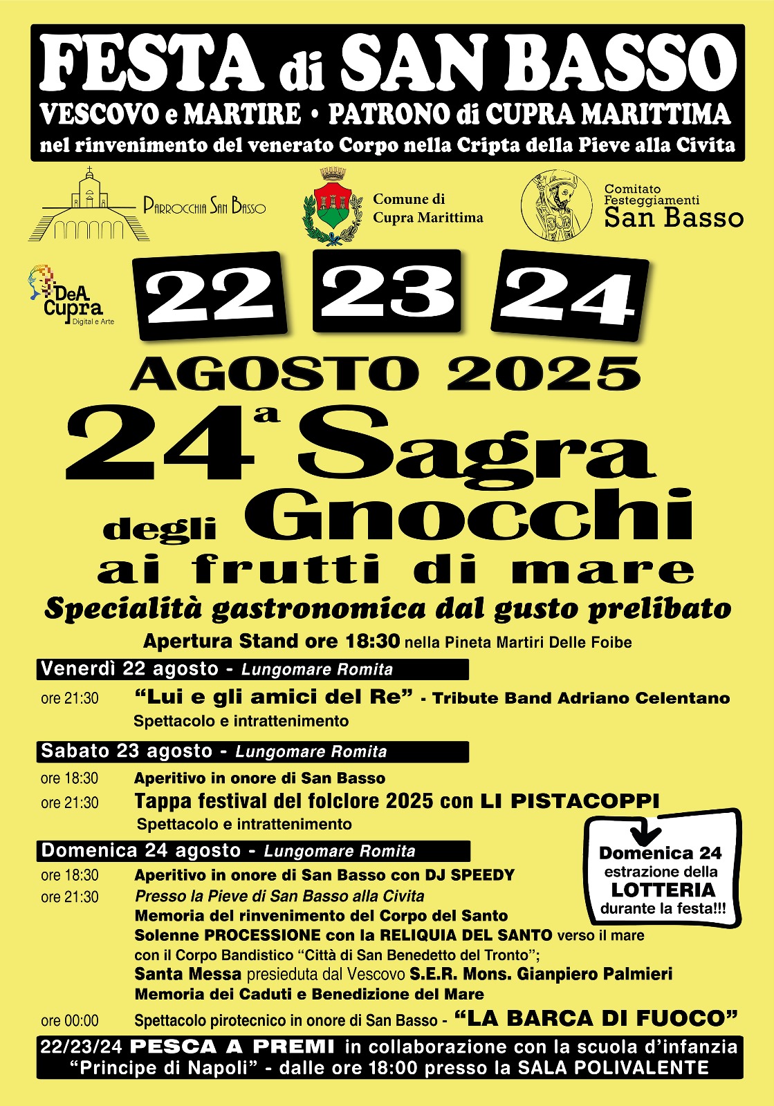 CUPRA MARITTIMA – È iniziata ieri, 22 Agosto 2025, a Cupra Marittima, la 24° edizione della Sagra degli Gnocchi, una delle iniziative programmate per la festa in onore del Santo Patrono, San Basso, vescovo e martire.
