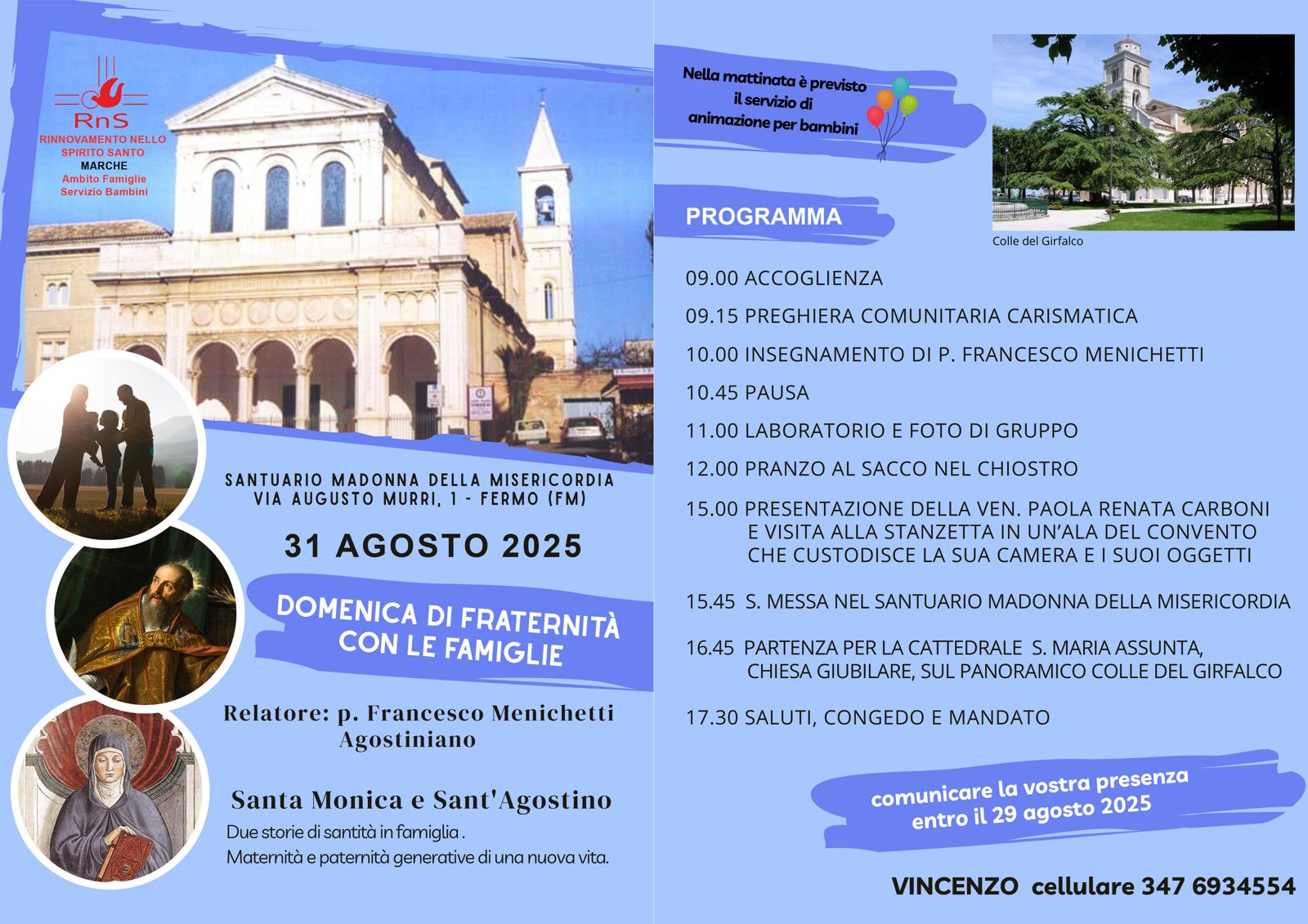 MARCHE – Le famiglie della regione sono invitate a partecipare a una domenica speciale all’insegna della fraternità e della fede, presso il convento degli Agostiniani Scalzi, annesso al Santuario della Madonna della Misericordia di Fermo.