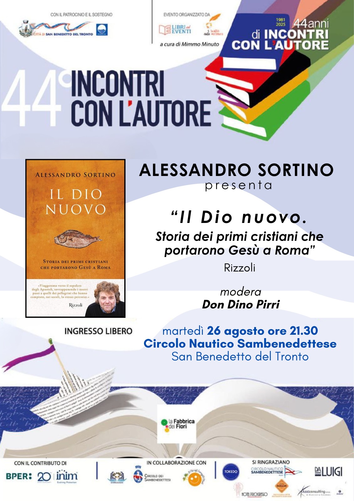 È con queste parole che don Dino Pirri presenta l’incontro che si terrà Martedì 26 Agosto 2025, alle ore 21:30, presso il Circolo Nautico in San Benedetto del Tronto, con Alessandro Sortino, giornalista professionista, celebre soprattutto per il suo contributo come autore e conduttore della trasmissione televisiva “Le iene“, ed autore del libro “Il Dio nuovo – Storia dei primi cristiani che portarono Gesù a Roma”.