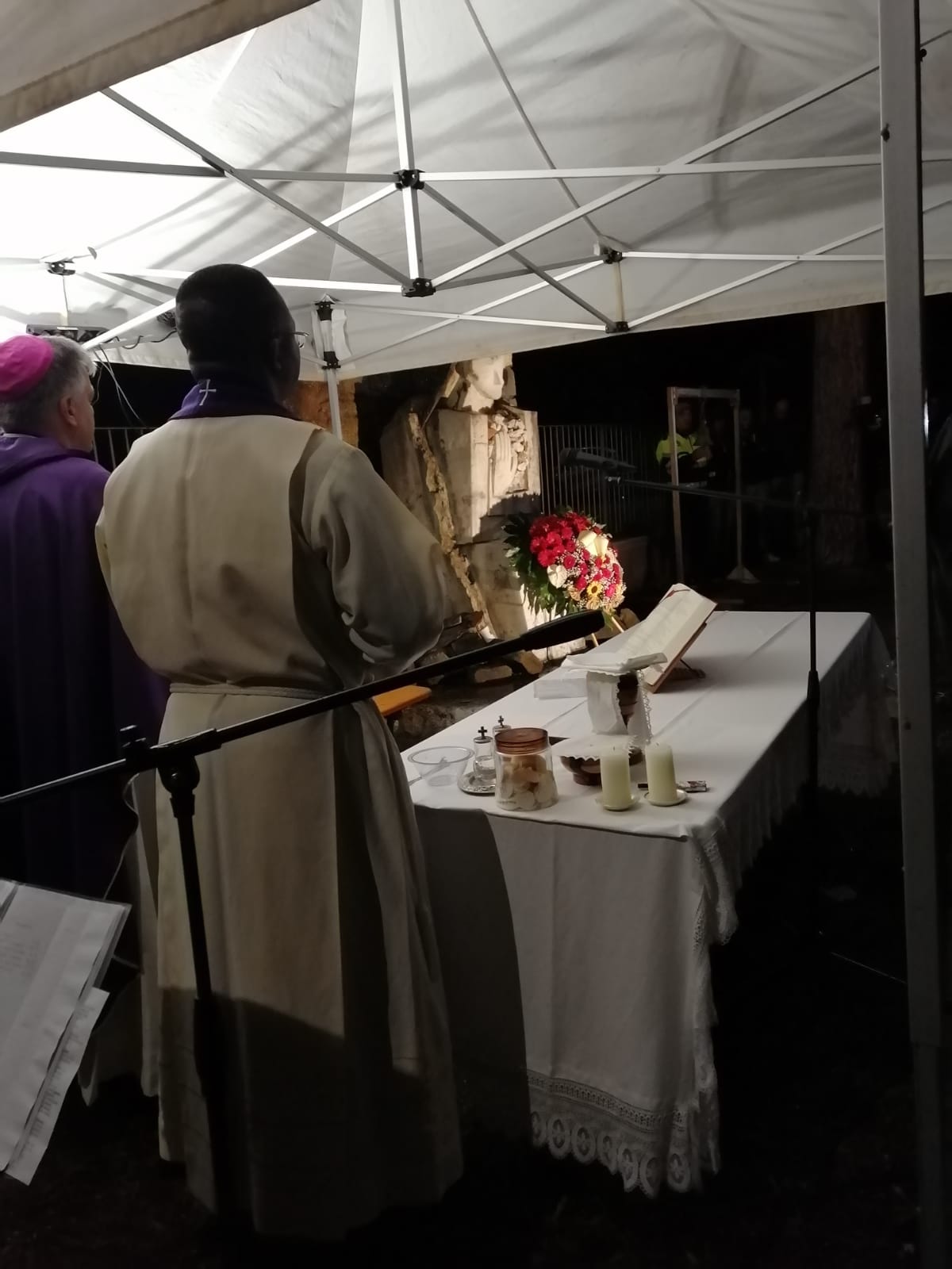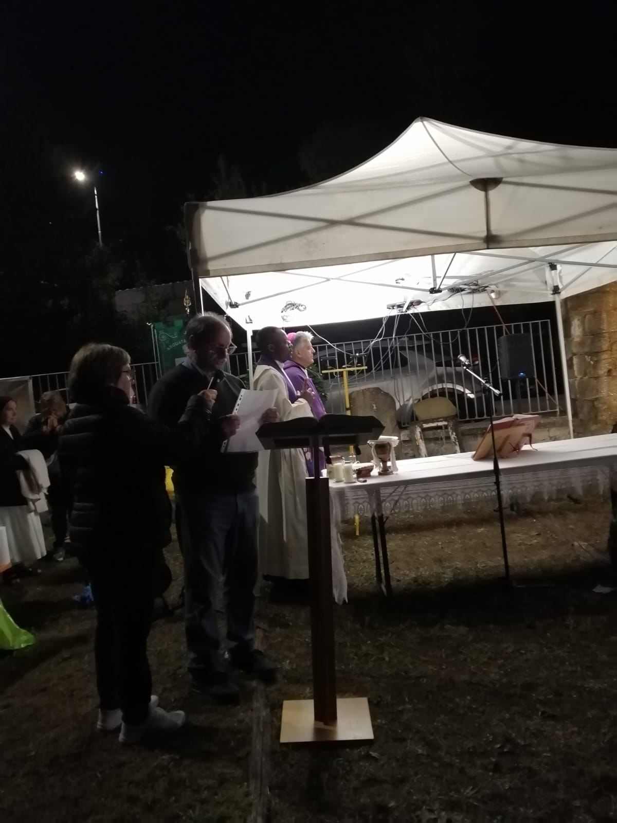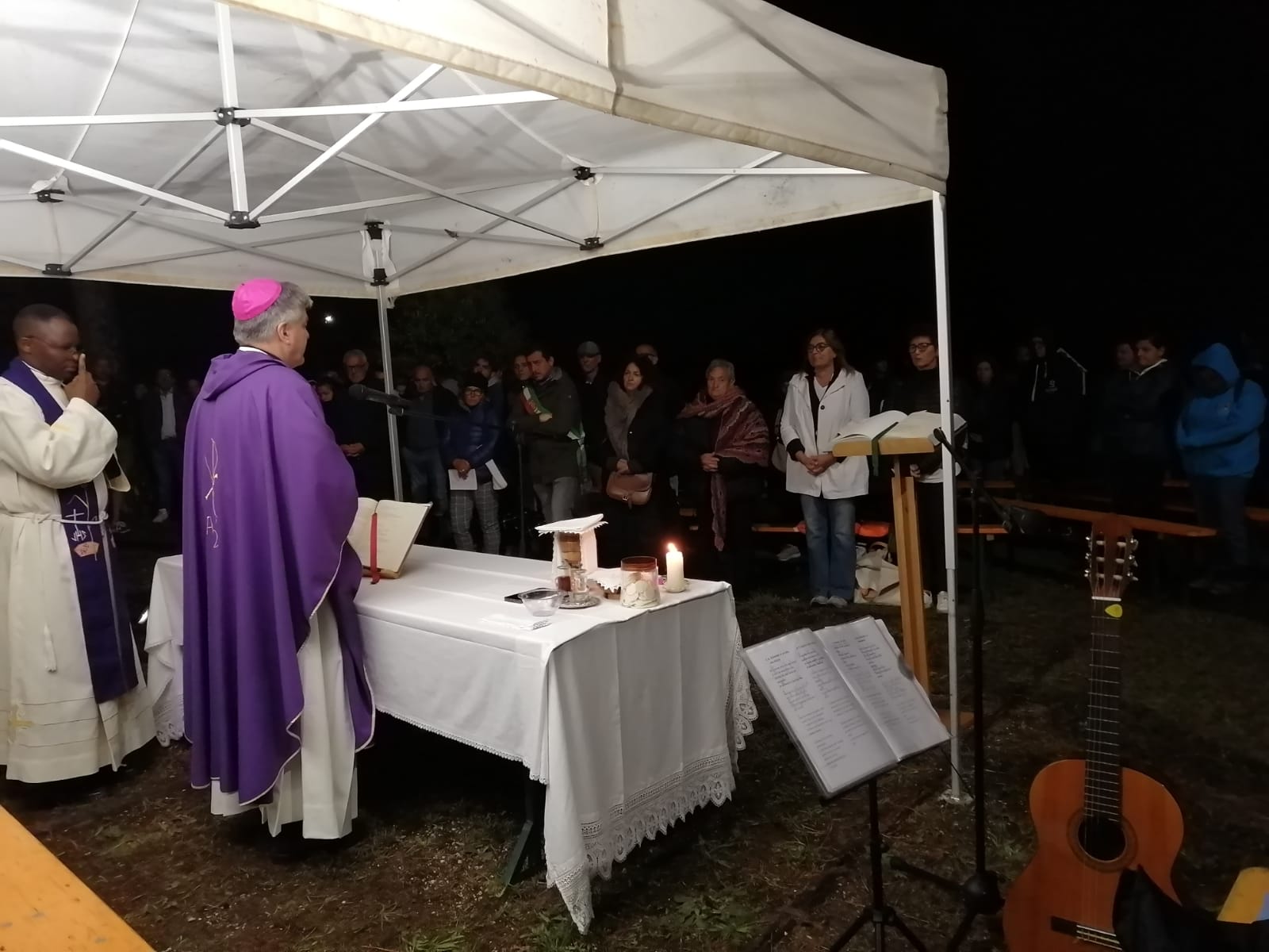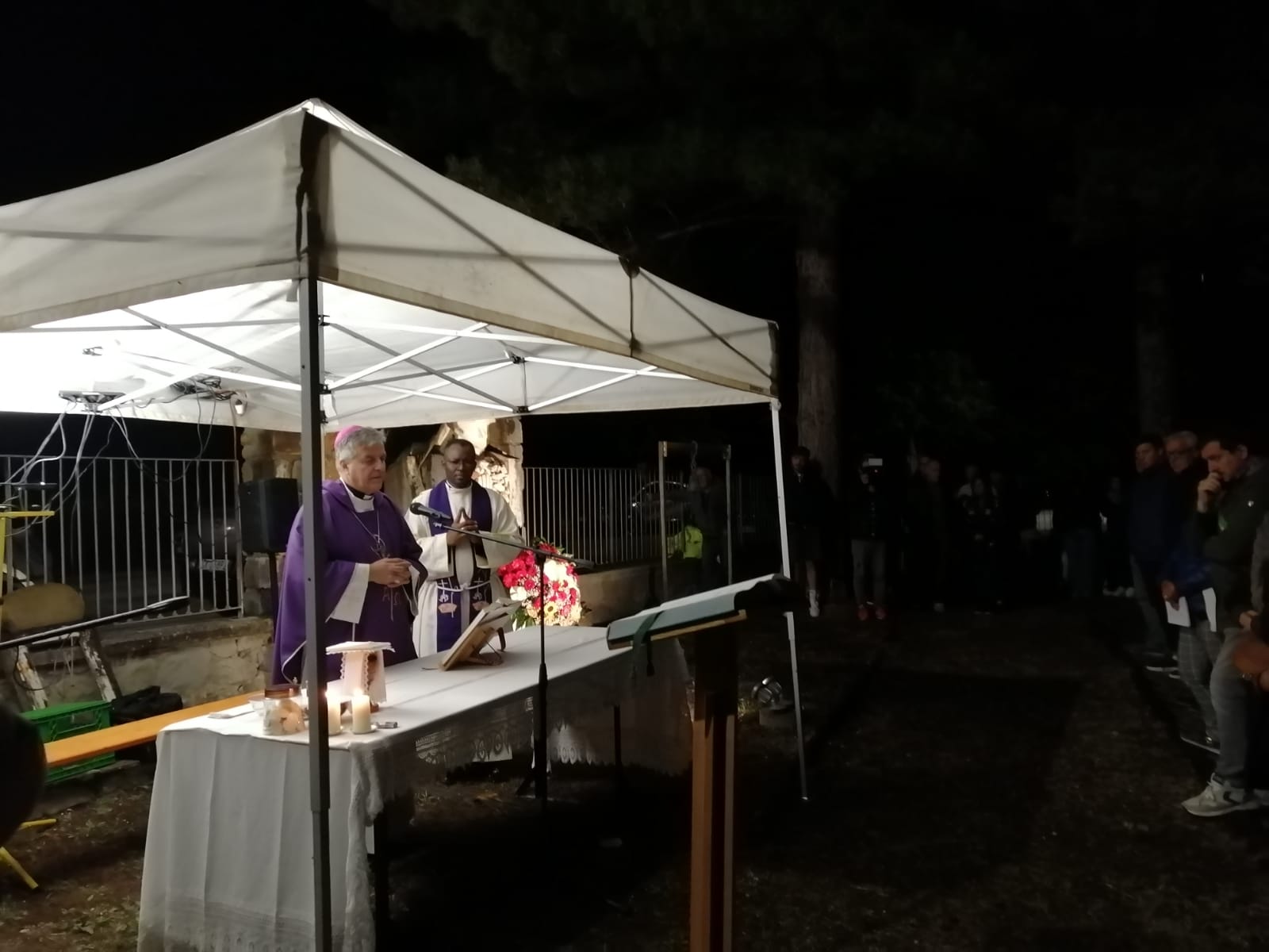 “Questa è una notte che è interrotta nel suo silenzio solo dallo scorrere dell’acqua della fontana e soprattutto dal rintocco delle campane – ha detto mons. Palmieri -. Quel suono delle campane ci riempie il cuore di dolore ogni anno, ogni volta che in questo giorno speciale viviamo questa Liturgia nel cuore della notte. Sappiamo quanto questo momento serva a ciascuno di noi per poter ricordare, esprimere il dolore, sentire ancora una volta il bisogno di stringerci e vivere, così, un momento che è un misto di tristezza e di speranza. Sì, speranza. Perché in questo nostro radunarci e stringerci più gli uni agli altri, oltre al dolore del ricordo, c’è anche il desiderio di ripartire, il desiderio di ricostruire. Un desiderio che emerge sempre e in maniera forte, seppur con le fatiche che tutto questo comporta e che conosciamo bene”.