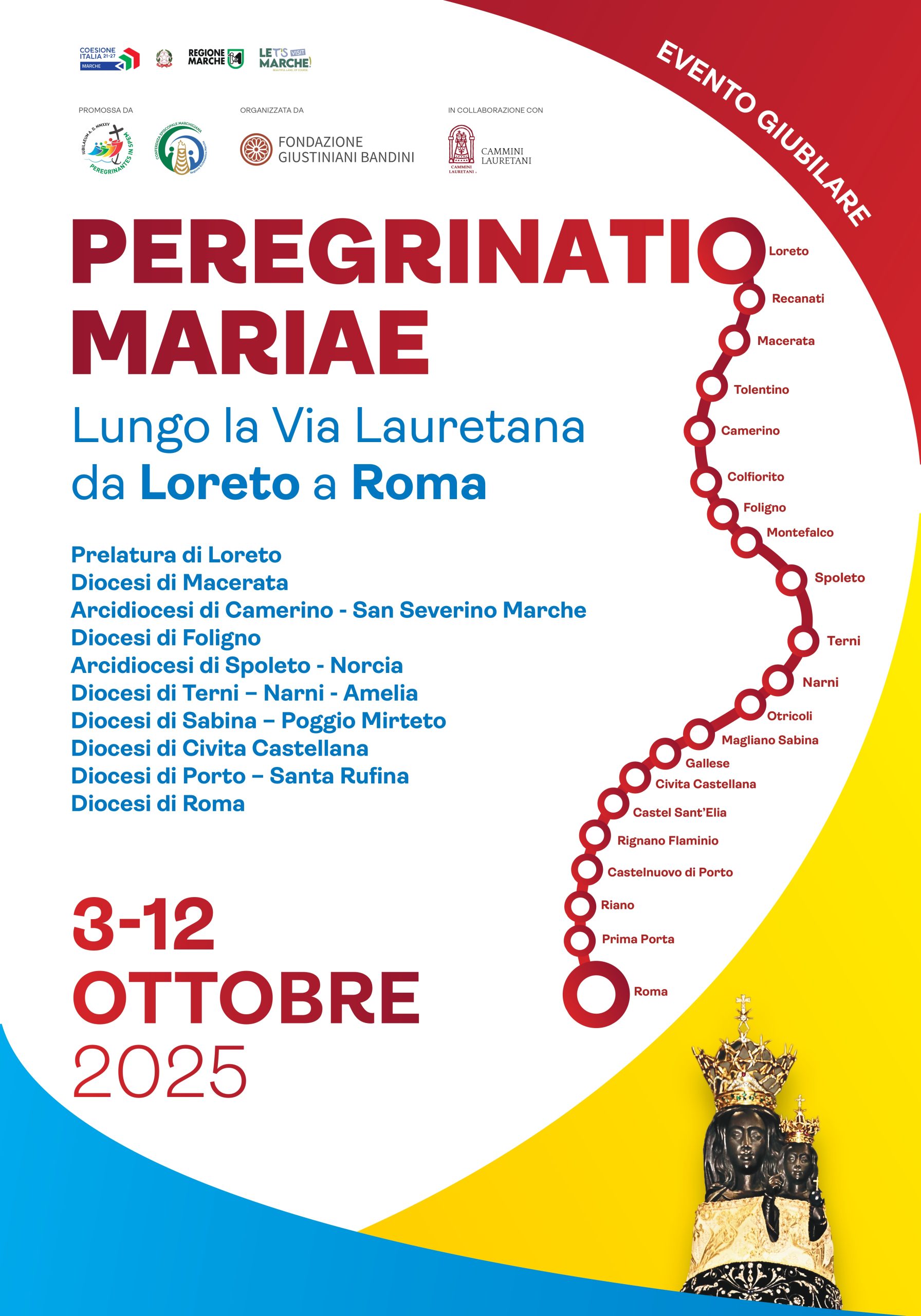 Dal 3 al 12 ottobre 2025, la statua della Madonna di Loreto, accompagnata da rappresentanze diocesane, partirà dal Santuario Pontificio della Santa Casa di Loreto per giungere fino a Roma, attraversando l’intero tracciato della Via Lauretana. Un pellegrinaggio simbolico che intende coinvolgere le comunità locali in celebrazioni liturgiche, momenti di preghiera e riflessione, promuovendo la spiritualità del pellegrinaggio mariano e valorizzando il patrimonio culturale e religioso che caratterizza i territori toccati dal Cammino.