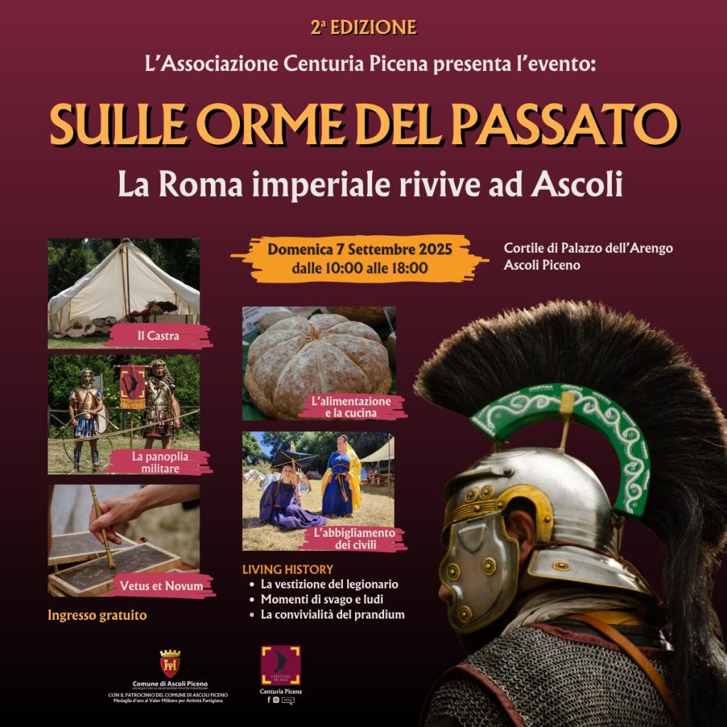 ASCOLI PICENO – Domenica 7 settembre 2025, dalle 10:00 alle 18:00, il Cortile di Palazzo dell’Arengo ad Ascoli Piceno si trasformerà in un affascinante viaggio nel tempo grazie alla seconda edizione dell’evento “Sulle Orme del Passato”, organizzato dall’Associazione Centuria Picena con il patrocinio del Comune di Ascoli Piceno.
