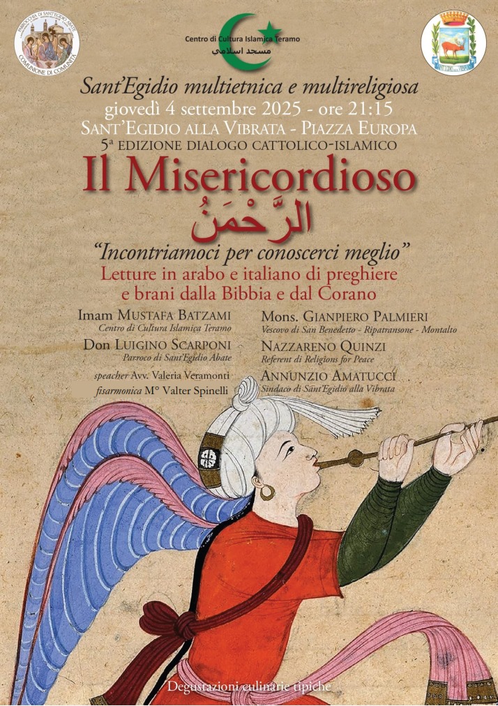 L’evento, che si terrà domani, Giovedì 4 Settembre, alle ore 21:15, presso piazza Europa, in Sant’Egidio alla Vibrata, avrà come tema di riferimento “Il misericordioso”, appellativo riservato a Dio, e nell’occasione verrà eseguita la lettura in italiano e in arabo di preghiere e brani riguardanti il nome di Dio e tratti dalla Bibbia e dal Corano.