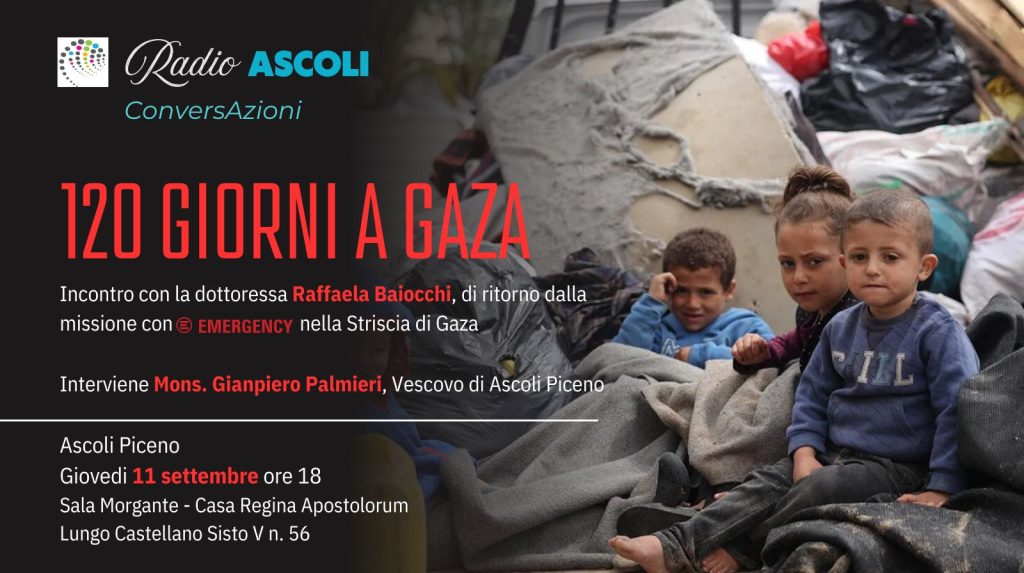 ASCOLI PICENO – Giovedì 11 settembre, alle ore 18, presso la Sala Morgante della Casa Regina Apostolorum in Lungo Castellano Sisto V n. 56, si terrà un incontro di straordinaria: “120 giorni a Gaza”, con la testimonianza della dottoressa Raffaela Baiocchi, appena rientrata da una missione con Emergency nella Striscia di Gaza.