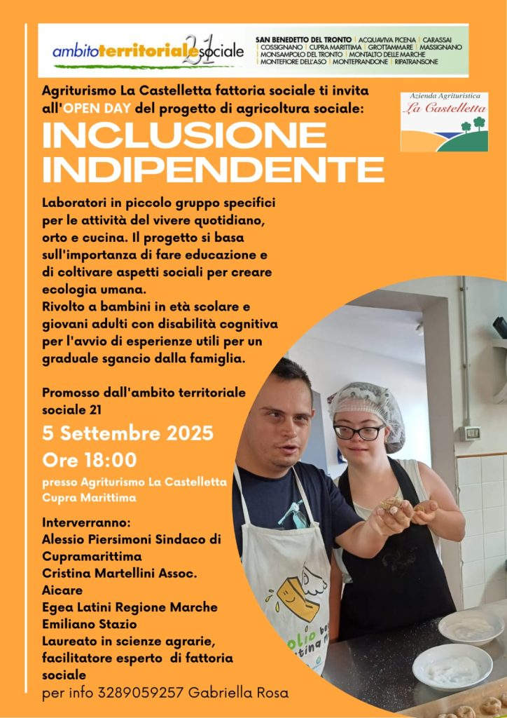 CUPRA MARITTIMA – Oggi, venerdì 5 settembre, alle ore 18.00, presso l’Agriturismo La Castelletta, fattoria sociale di Cupra Marittima, si terrà l’open day del progetto di agricoltura sociale “Inclusione Indipendente”. L’iniziativa è rivolta a bambini in età scolare e a giovani adulti con disabilità cognitiva, con l’obiettivo di avviare esperienze che favoriscano un graduale distacco dalla famiglia e la crescita dell’autonomia personale.