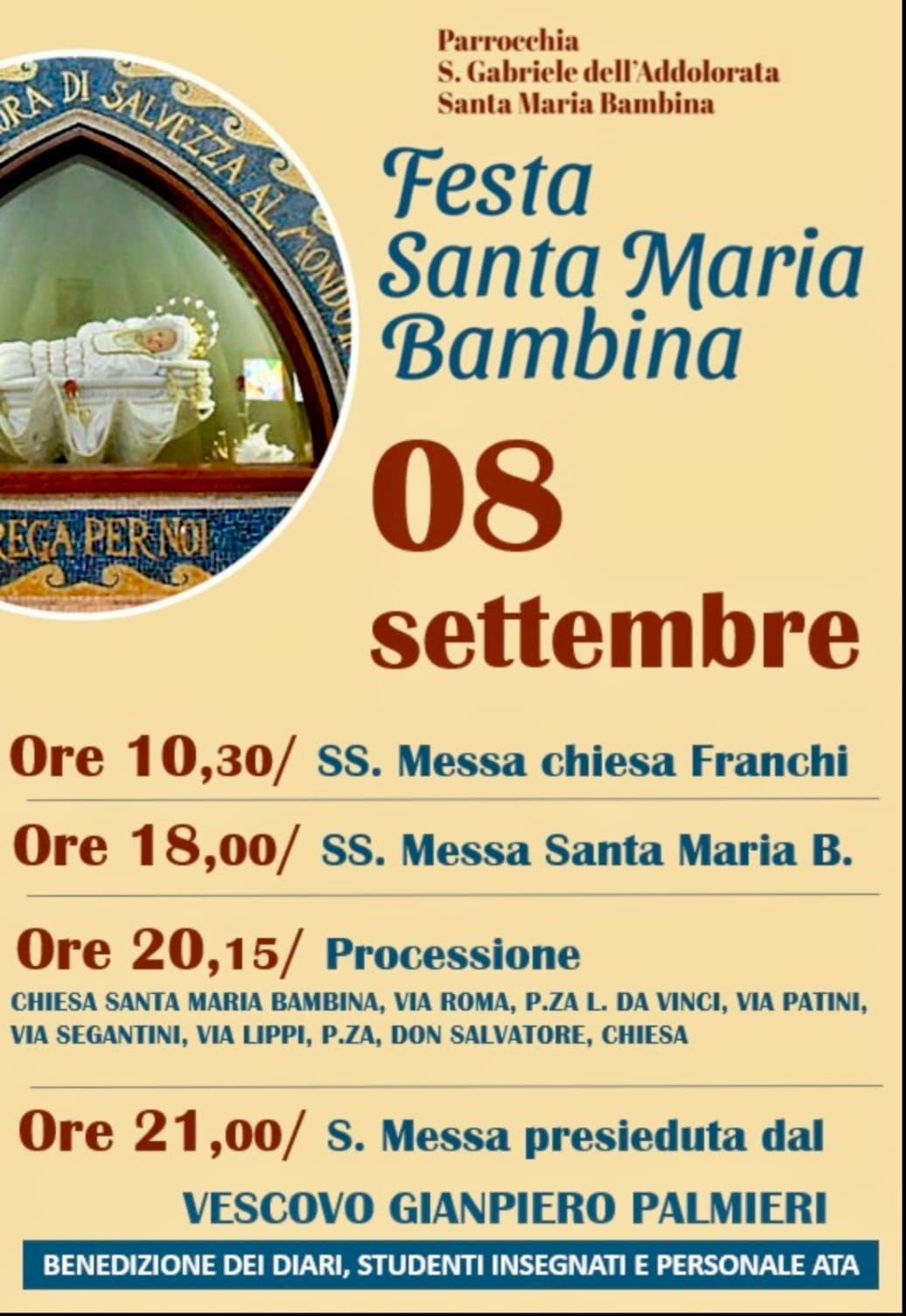 Il parroco, don Alfonso Rosati, afferma: “Dopo la pausa estiva delle attività parrocchiali, la ricorrenza di Santa Maria Bambina sarà l’occasione per riunire la comunità e celebrare due importanti anniversari: i 92 anni dell’istituzione della nostra parrocchia, dedicata a Santa Maria Bambina, e i 26 anni dalla consacrazione della nostra chiesa S. Gabriele dell’Addolorata, più ampia e adatta alle esigenze della nostra comunità in crescita.