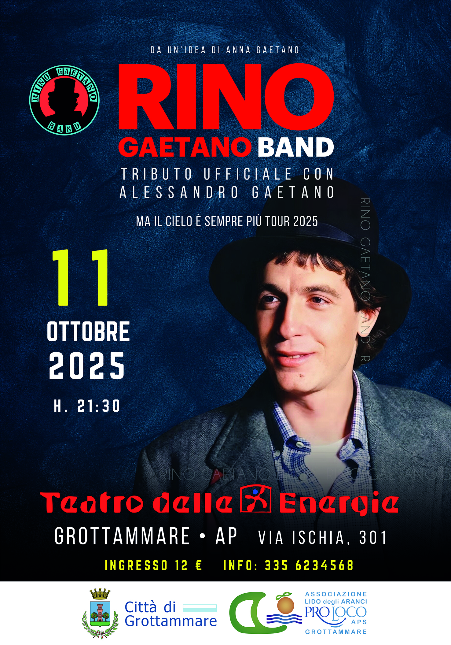 Il primo grande appuntamento è fissato per sabato 11 ottobre alle ore 21.15 al Teatro delle Energie: sul palco arriverà la Rino Gaetano Band, formazione ufficiale dedicata al cantautore calabro-romano, con lo spettacolo “Il cielo è sempre più blu”. I biglietti, numerati, sono disponibili al costo di 12 euro.