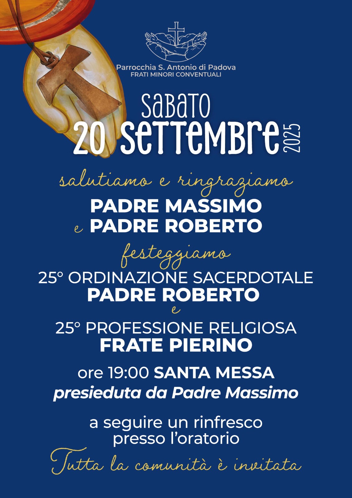 Daniela Pucci e Paolo Marano, rispettivamente segretaria e membro del Consiglio Pastorale parrocchiale, a nome della comunità, dichiarano: “È un ringraziamento profondamente sentito quello che noi fedeli della parrocchia di Sant’Antonio di Padova vogliamo esprimere in ricordo dei 25 anni della professione di fra’ Pierino, nel 25° anniversario di sacerdozio di padre Roberto e nel saluto a padre Massimo e a padre Roberto che si apprestano a lasciare la nostra parrocchia per altra destinazione.