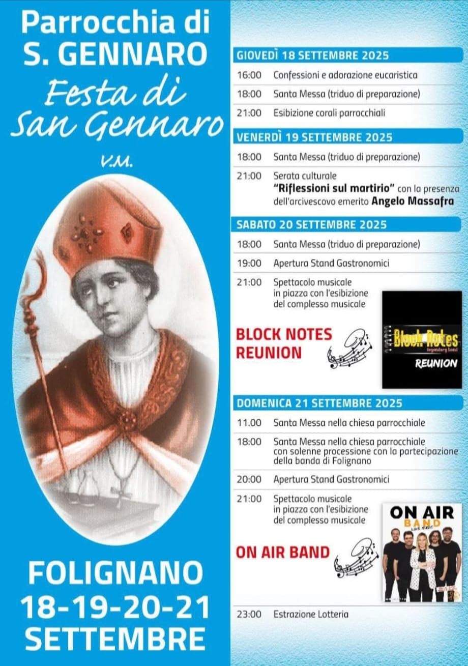 “Già ieri la nostra comunità parrocchiale ha vissuto alcuni bei momenti – prosegue Spurio -. Ieri pomeriggio abbiamo avuto la possibilità di accostarci al Sacramento della Riconciliazione, di fermarci per un momento di preghiera e raccoglimento profondo attraverso l’Adorazione Eucaristica ed infine di vivere l’Eucaristia con la Celebrazione delle ore 18:00. In serata si è tenuta in chiesa una meravigliosa esibizione delle corali parrocchiali che hanno dato vita al Concerto ‘San Gennaro, un viaggio tra le armonie senza tempo’,  accompagnate dall’organista Mirko Peci e con la direzione artistica di Anna Maria Corena ed Emidio Bollettini. Oggi avremo una serata culturale con la presenza di mons. Angelo Massafra, arcivescovo emerito di Scutari, in Albania, che ci farà riflettere sul martirio. Seguiranno poi le giornate del 20 e 21 Settembre che vedranno la presenza di due gruppi musicali: i ‘Block Notes Réunion’ e la ‘On Air Band’.  Ma i momenti più attesi saranno, come sempre, quelli di Domenica 21, quando verrà anche il nostro vescovo Gianpiero Palmieri a presiedere la Celebrazione Eucaristica e porteremo in processione la statua del nostro San Gennaro, accompagnati dal  sindaco e della banda musicale. Nelle giornate di Sabato e Domenica, inoltre, ci saranno anche alcuni stand enogastronomici che prepareranno piatti tipici e sfiziosi. Al termine delle manifestazioni, Domenica, ci sarà anche l’estrazione della tradizionale lotteria“.